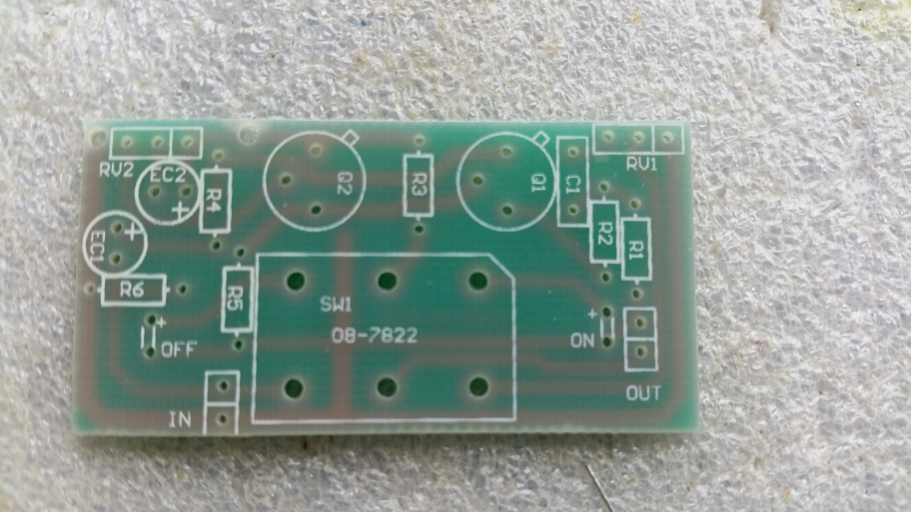 Inspired with confidence I jumped back to the Fuzz kit. After a short time discovered that the foot switch was faulty so set about replacing that. Now that 'bypass' worked I discovered that in bypass this pedal does nasty things to the clean signal. The switch only changes over the output from pedal to bypass and turns on the LED, the input to the pedal is always connected to the guitar so the nasties are coming out of the input to the fuzz board which is not good. When engaged there is some intermittent bits of fuzz in between lots of pops and crackles. A few minutes with the multimeter confirmed nil shorts and the values of the resistors are still fine, and that the transistors are still okay, so something else must be going on which I'll hunt for on another day..