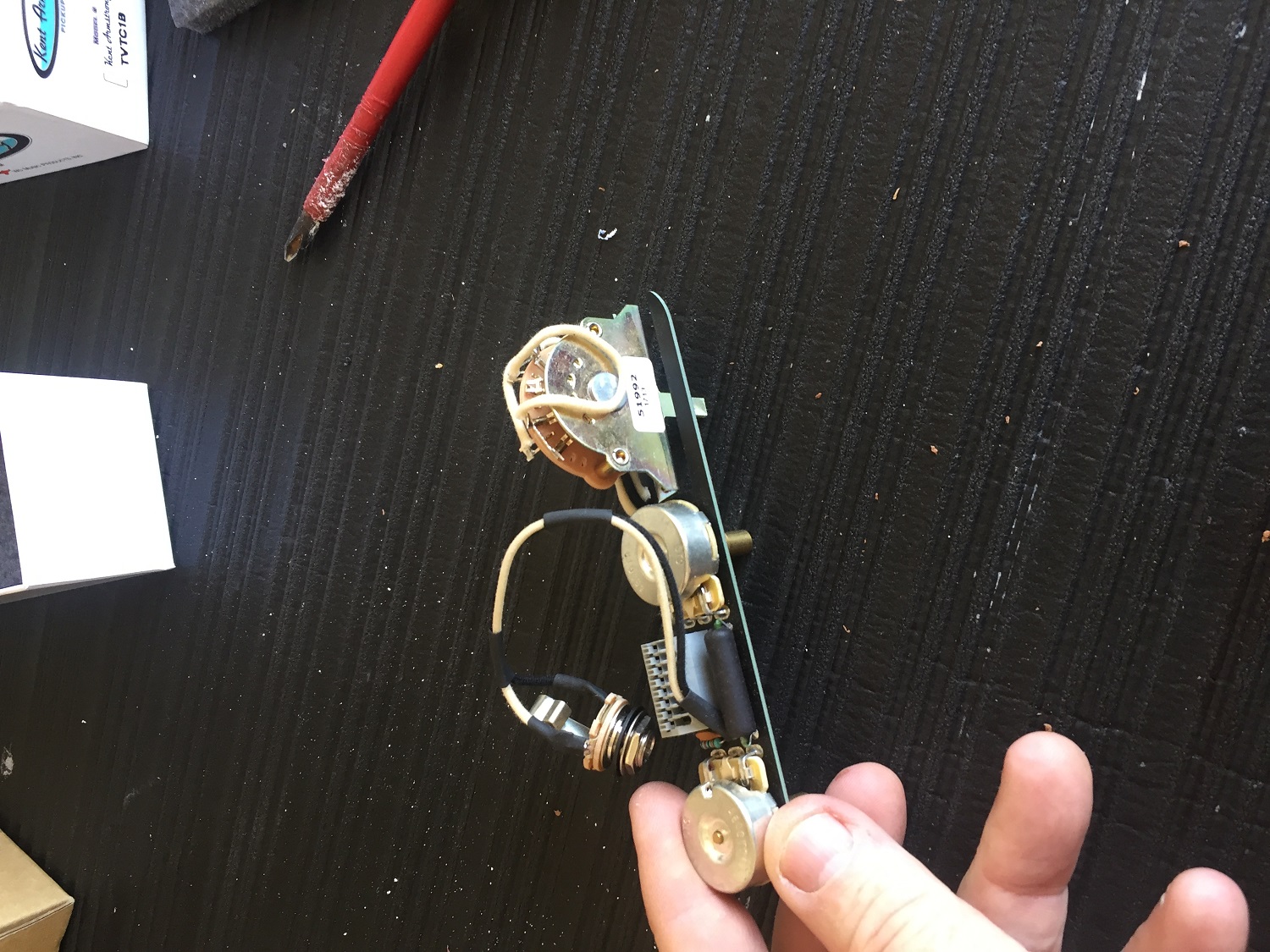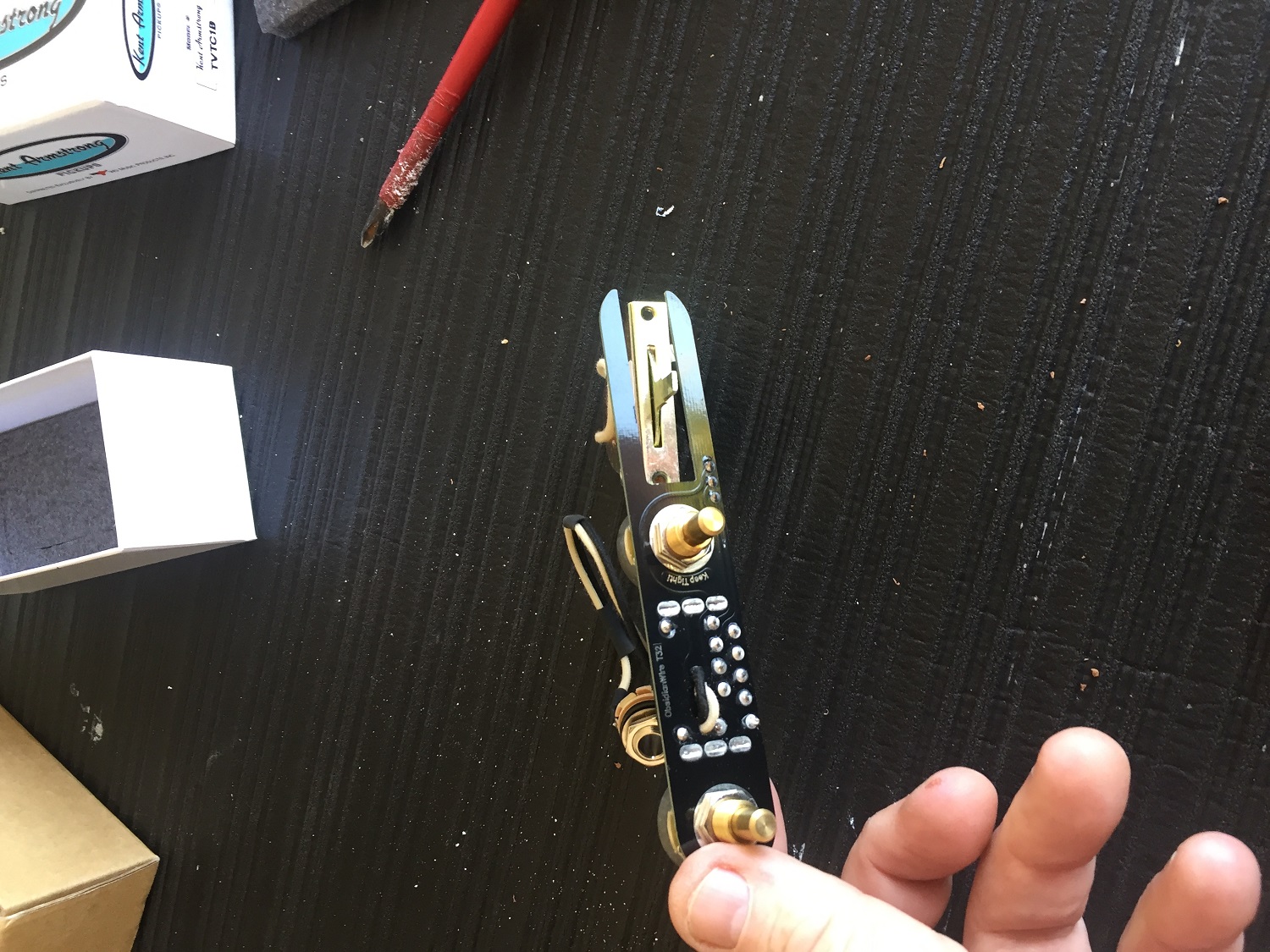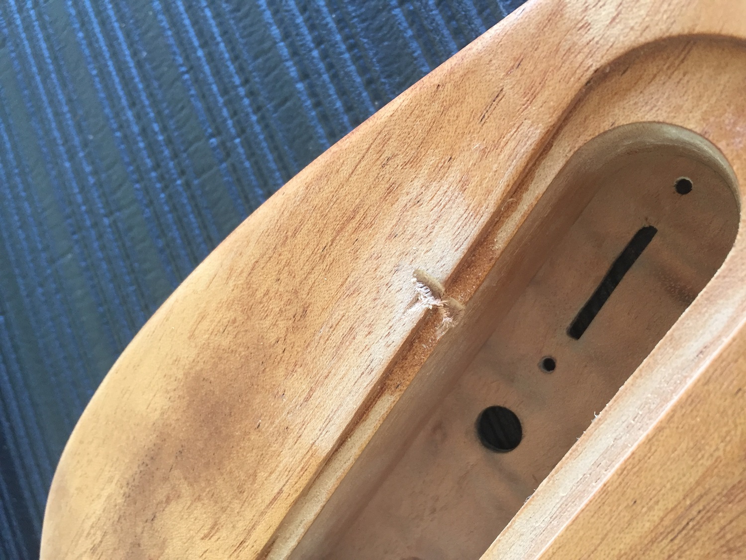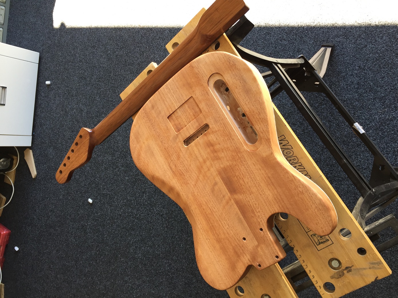 After a bit of a break did some finalisation assembly before the last few coats of tru oil on the body and got the placements right for screw holes. Test fitted the Obsidian wire three way prewired assembly (these are worth checking out-made in NZ) and all good. Has quick connect arrangement so no soldering and easy pickup changes.