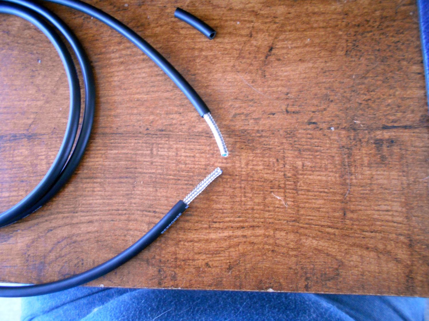 While holding the cable bent back on itself in my fingers, I used the craft knife to cut through the outer-sheathing of the cable, exposing the braid underneath it, while at the same time being very careful not to nick any of the strands of wire in the braiding: