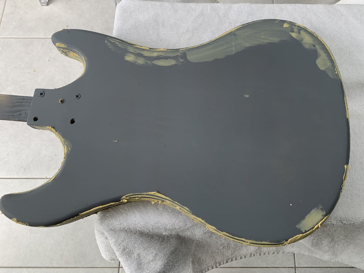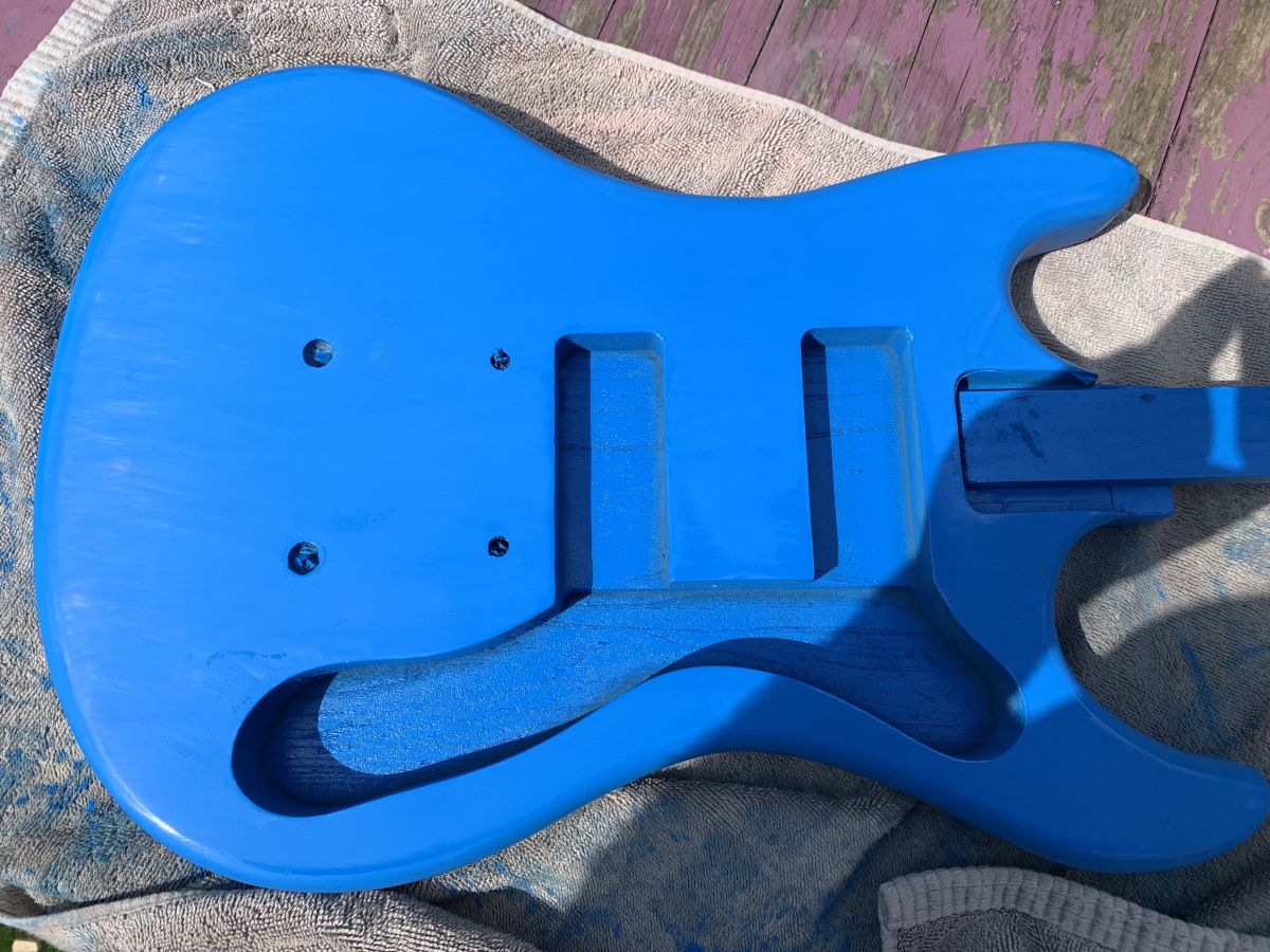 Here are a few photos, no point in highlighting every stage as it's very tedious and a bit repetitive! The photo of the blue finish is with it rubbed down ready to receive a quick blow over then lacquer. The only near catastrophic moment came when the coat hanger it was hanging from snapped after constant twisting, luckily I was holding onto the wooden neck replacement.
