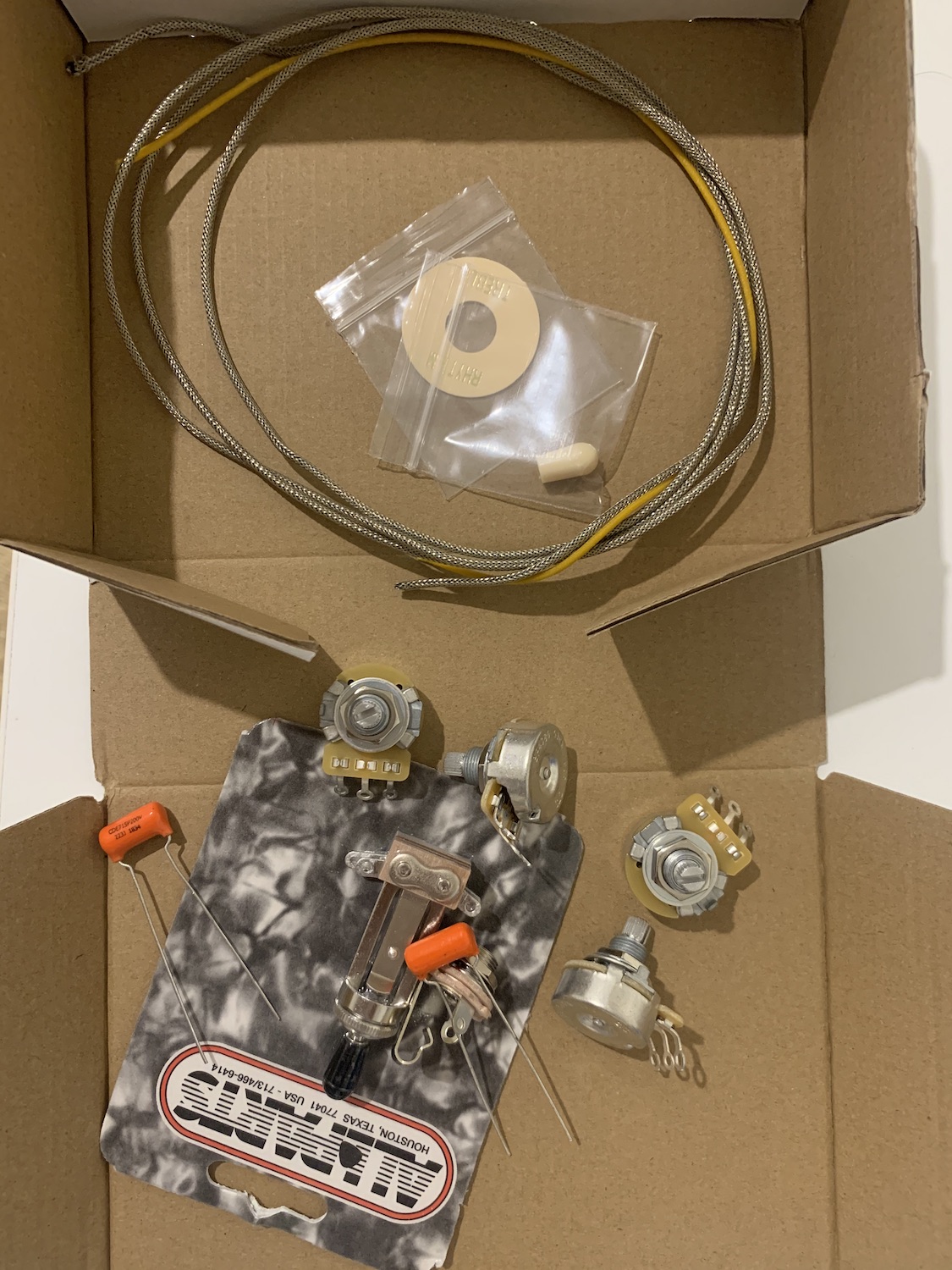 Wiring goodies arrived yesterday. I’m feeling a long way off wiring, but I did want to check how much thread I have on those pots to see how feasible it would be to put some reinforcement in the bottom of the cavity. It looks pretty tight though.