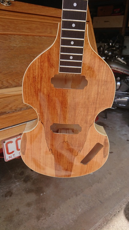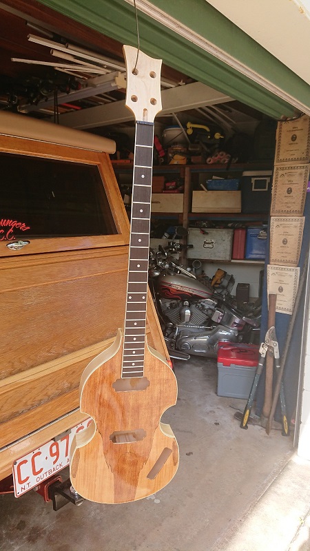 A couple of pics of the Bass hanging out to dry, hopefully it will harden in our humid climate. I see with envy the posts on youtube about multiple coats in one day, nup, not for me, very long slow drying time but the finish is great so no complaints. I am somewhat disappointed by one blemish that it came from the factory with and it will stand out like doggies dangly bits, there is a bad bruise in the sub layer before the veneer was applied, no amount of steam or anything I tried could shift it. I did report it but did not receive positive response. It will be on the edge of the pick guard which I think will make it obvious, oh well my part is all done with care and love.