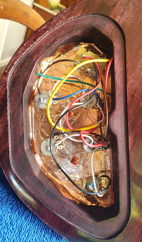 Got the wiring done, sheilded most of the guitar (1 pack from pitbull wasn't close to being enough) with the two pickup cavities being done and just needing some more to get the sides of the control cavity and the back of the backplate done.