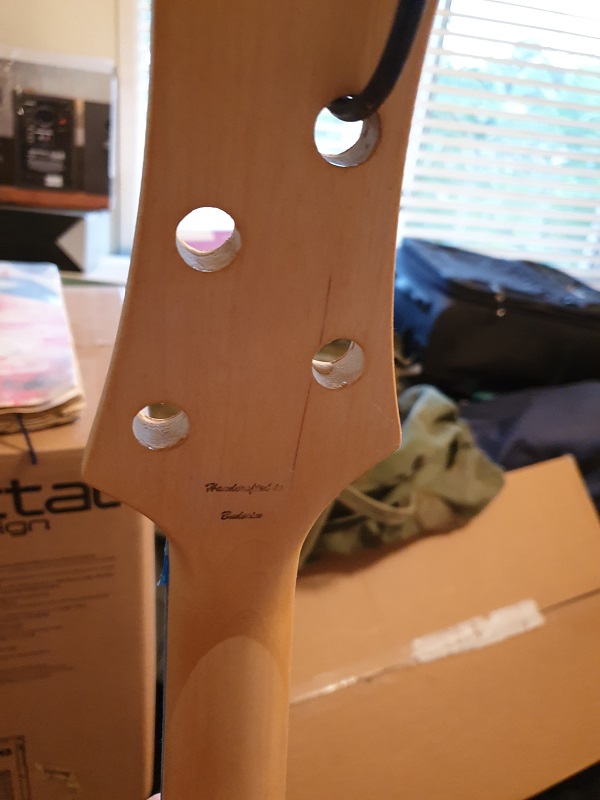 The headstock has had four coats of Tru Oil, including the last one as a tru oil wet sand at 600 grit. Logos on this morning, they appear to have something to grip on to now.