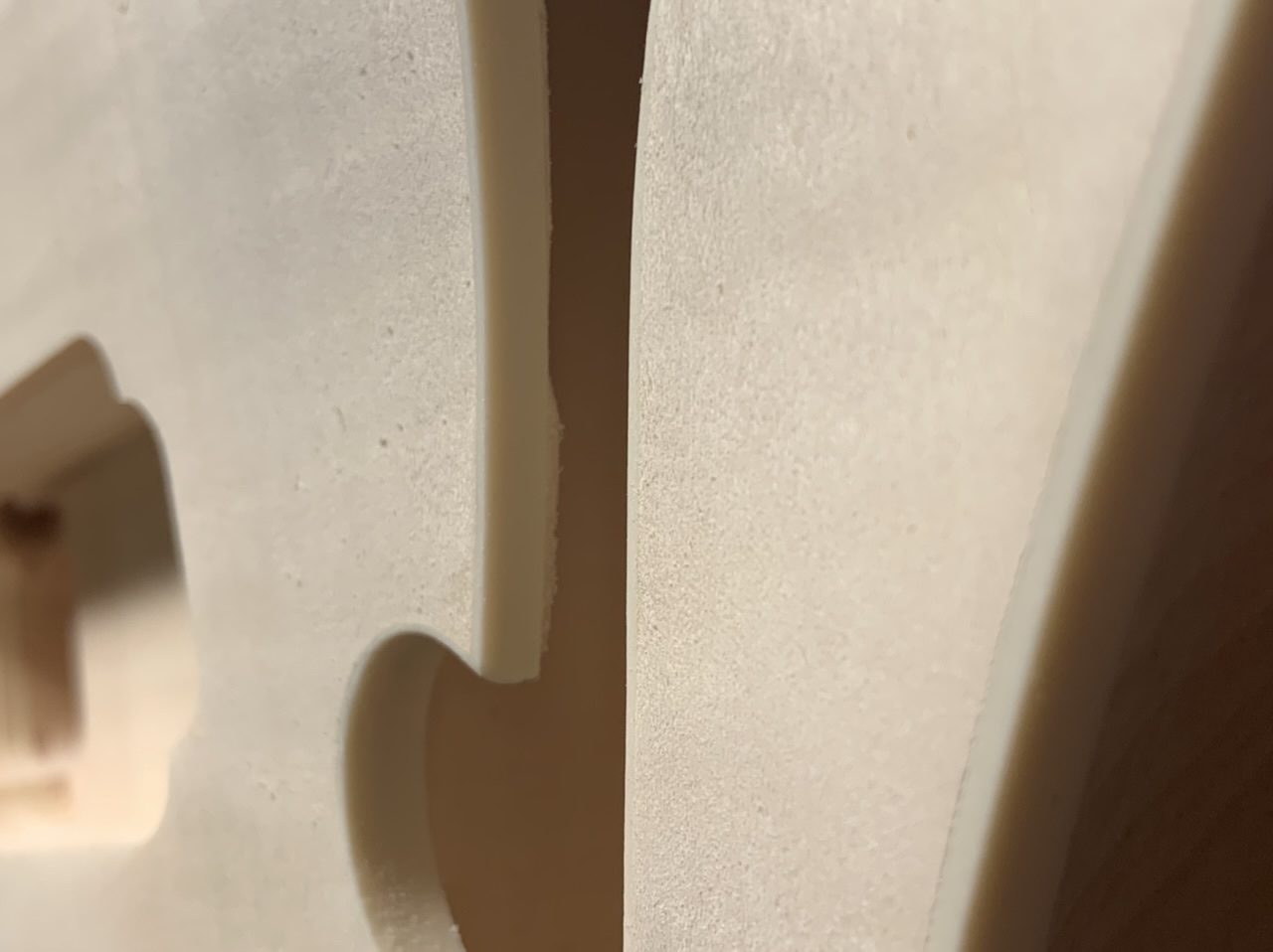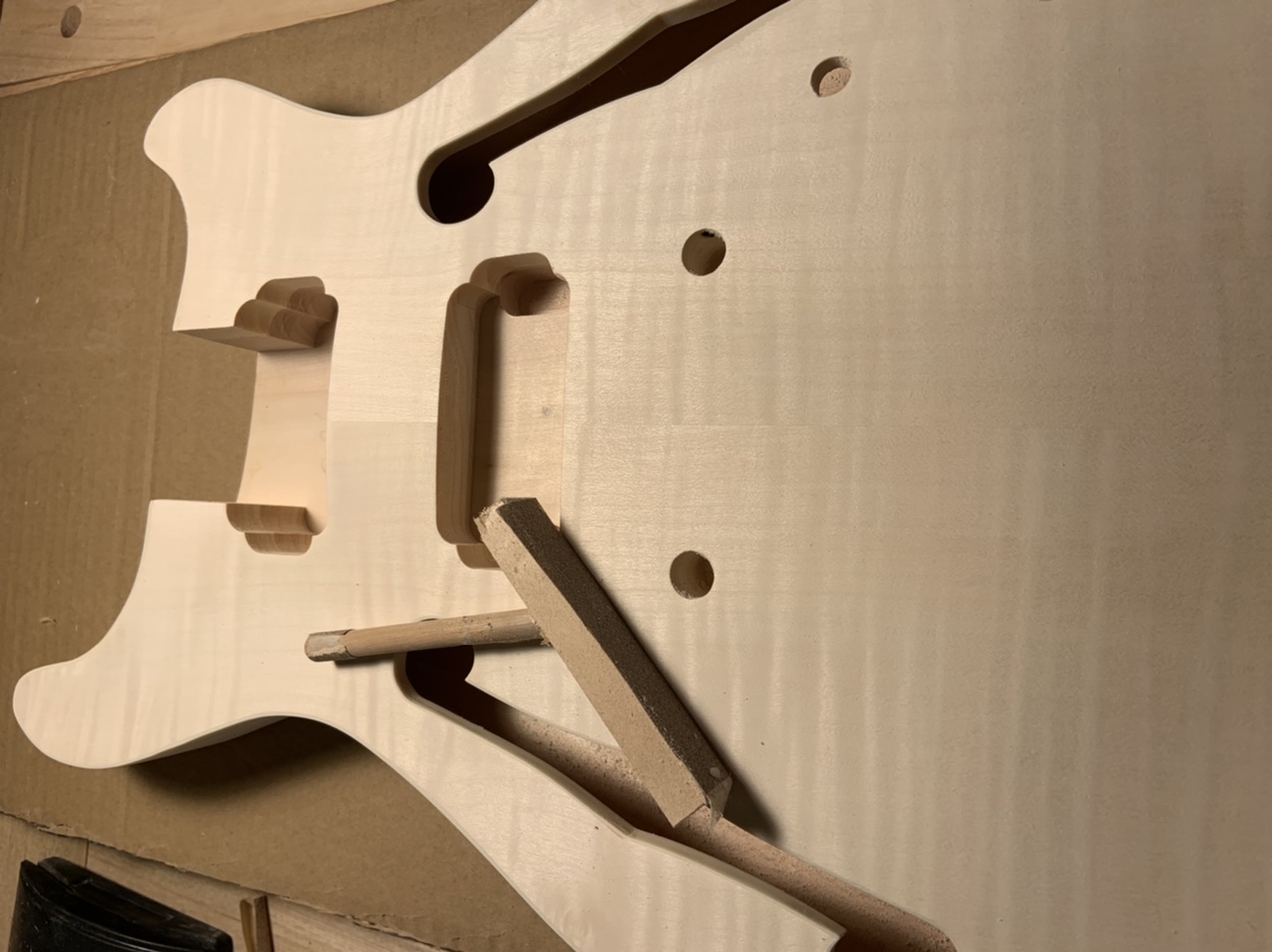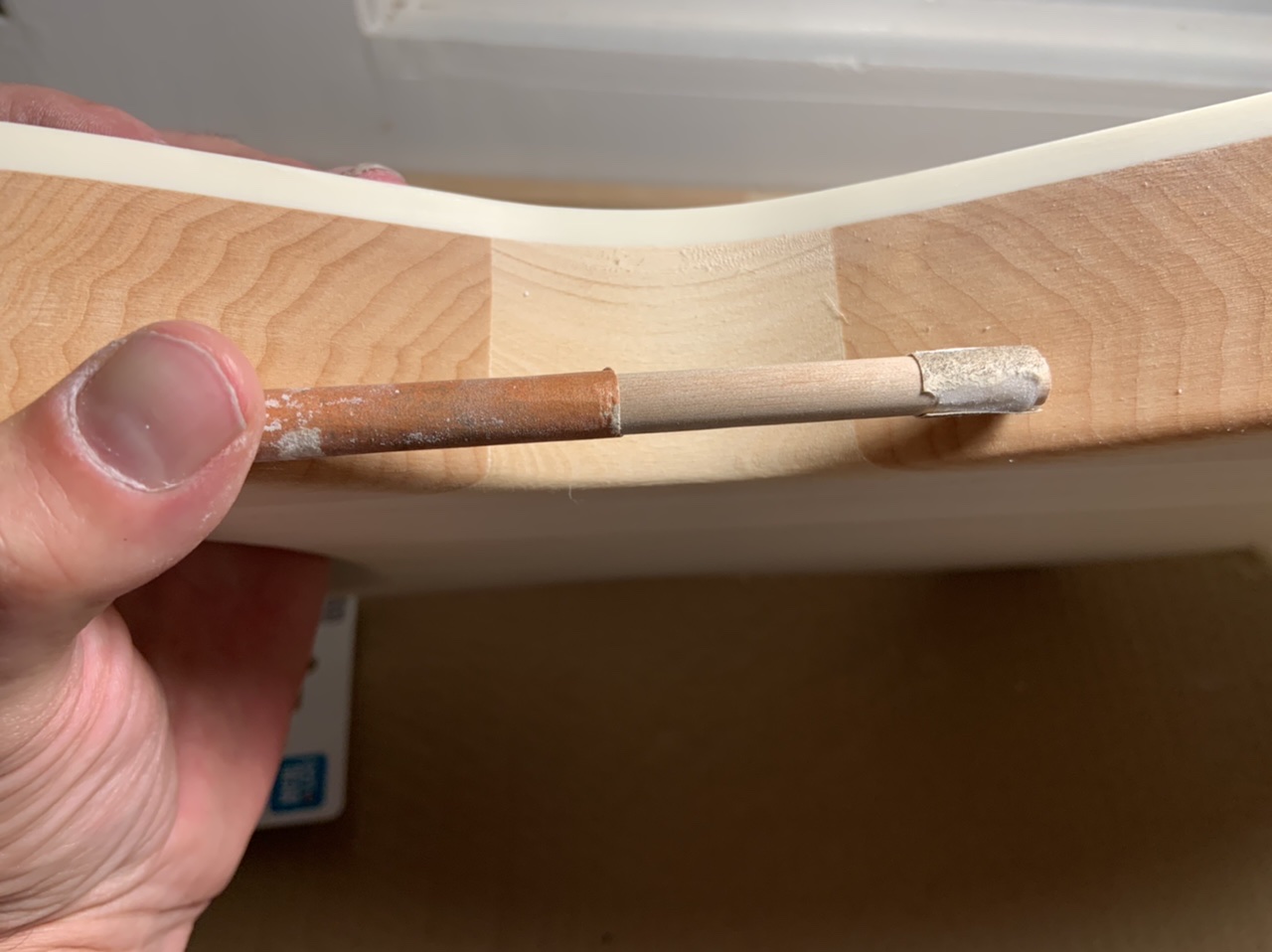 This one at least is definitely worth sharing . Inside the F-holes was a mess. I made this little tool to sand the bottom. Then I realized I could also use it for the underside of the top! It’s just a scrap wood block, with a hole drilled at an angle and a down stuck in it. I then put double-sided tape on the bottom to adhere sandpaper, then ended up doing the same to the top.