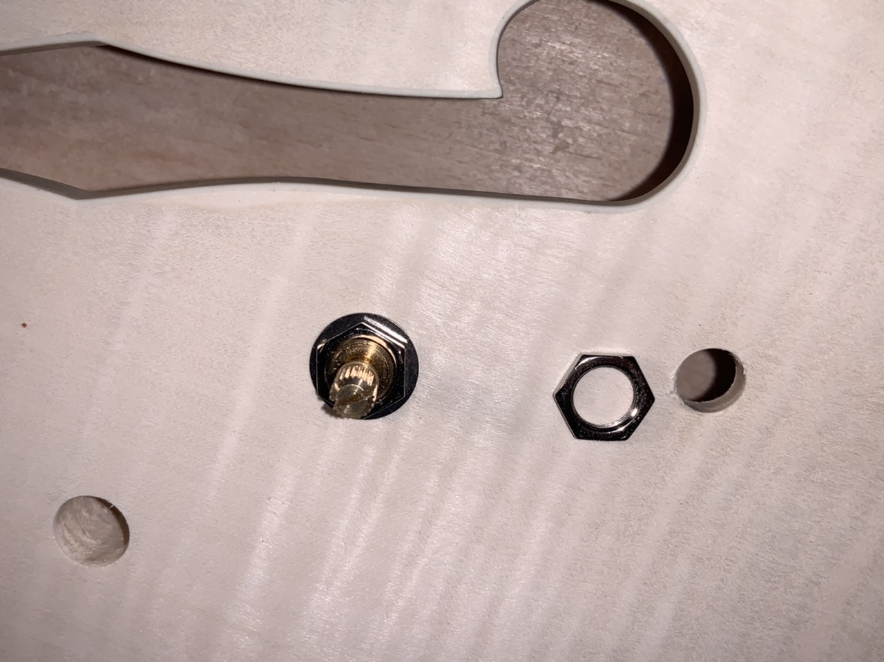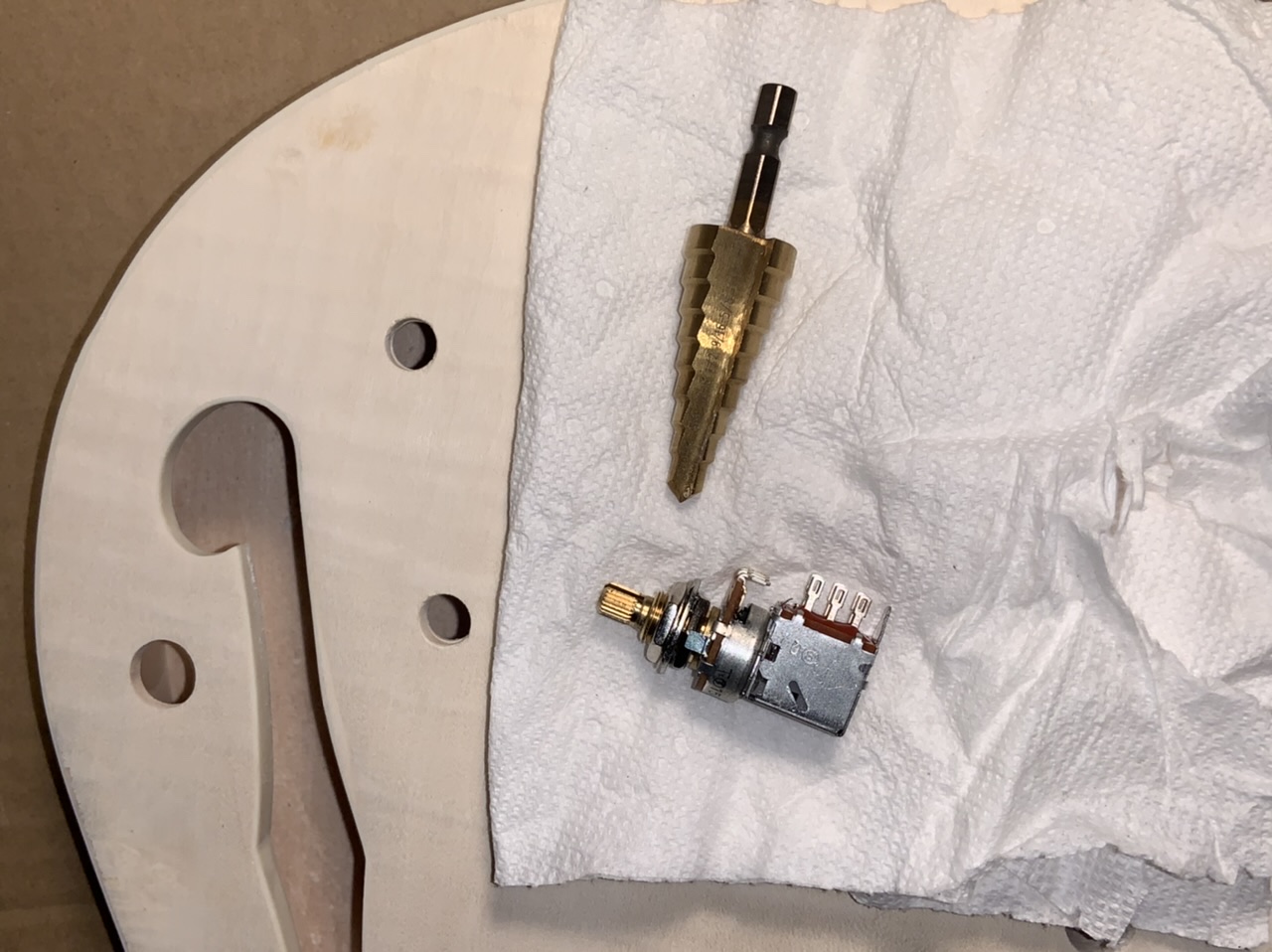 ID:	35892I believe tear-out is a fear when enlarging controls holes. I used a stepped reamer and tried it by hand - as in literally holding and turning the bit by hand. Since I didn’t keep the bit perfectly straight the holes aren’t perfectly round, but there is no tear out, the pot fits well, and the hole is well within the diameter of the nut.