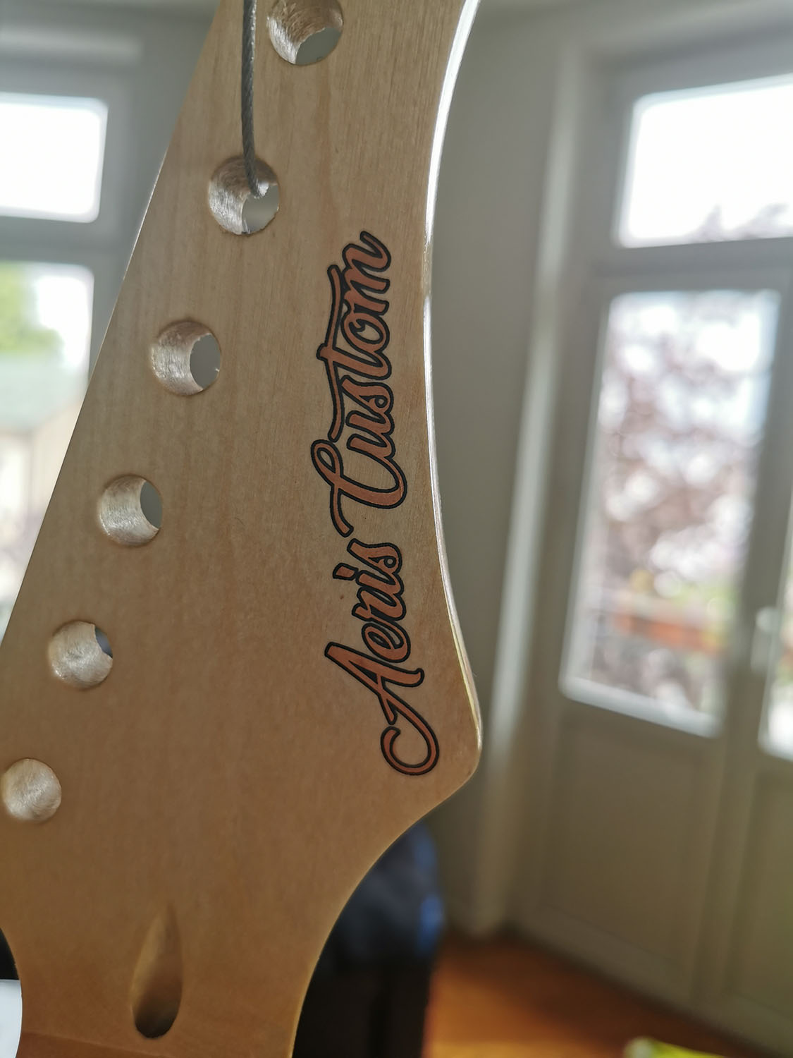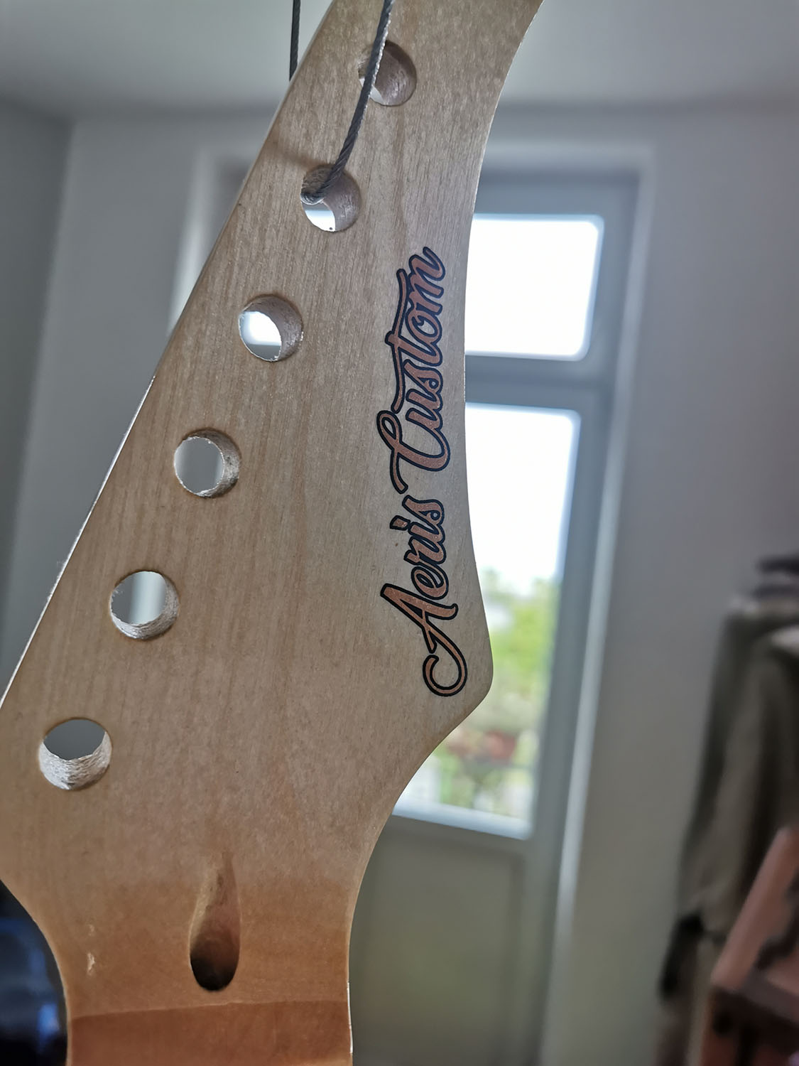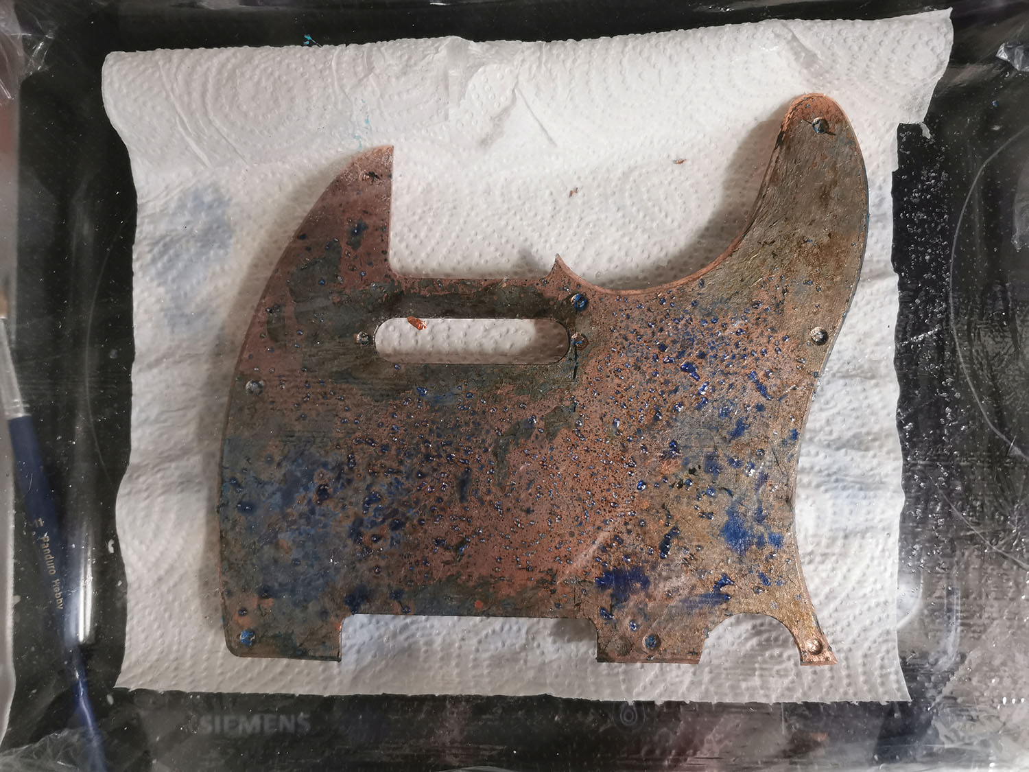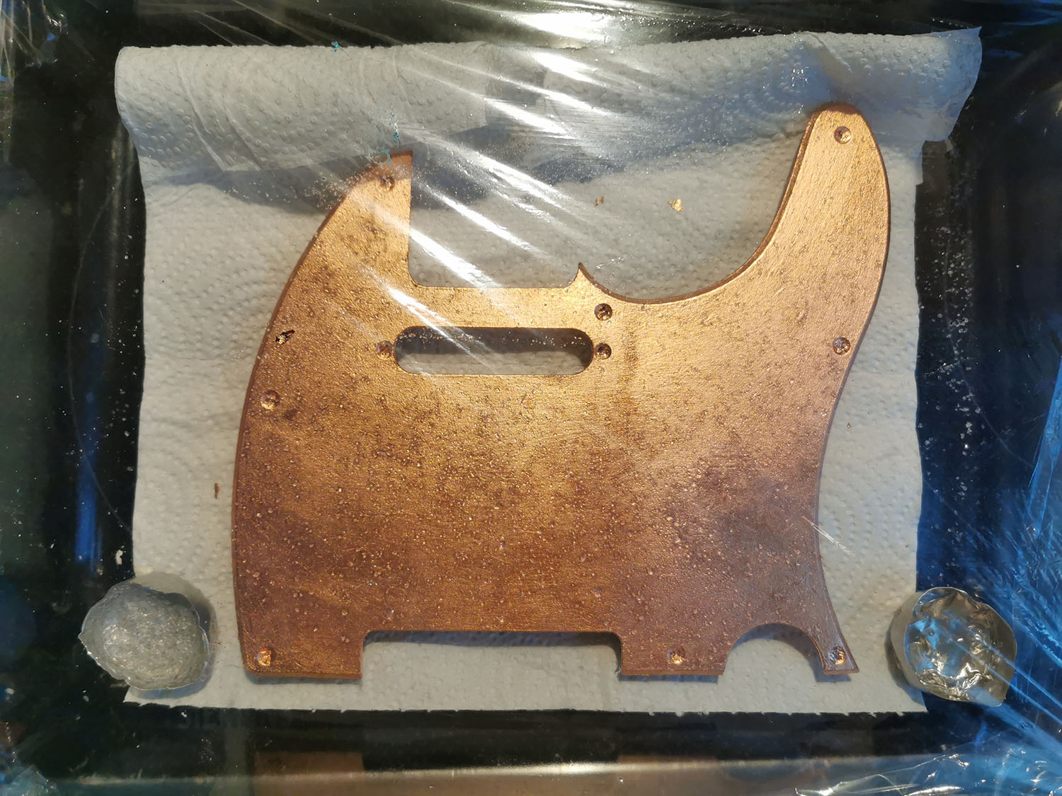 The guitar comes with a white pickguard which I hope to be able to copper leaf and then age with vinegar and salt.