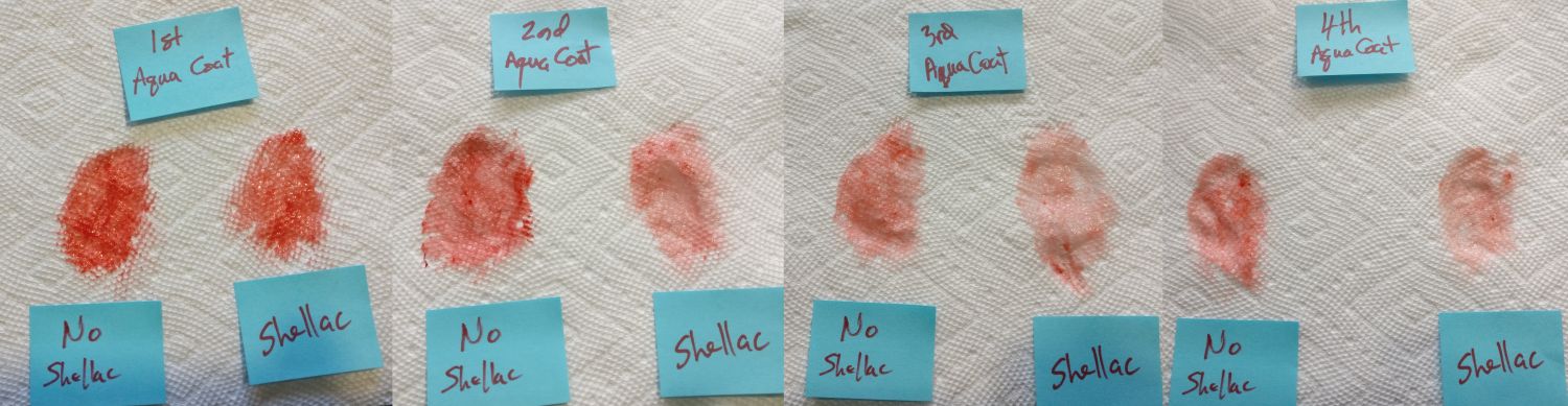 With the first coat it seemed comparable, with maybe a slight edge to the shellac. This was consistent with every application. Shellac side did a bit better on color lift, but not dramatically different. In both cases color lift was manageable.