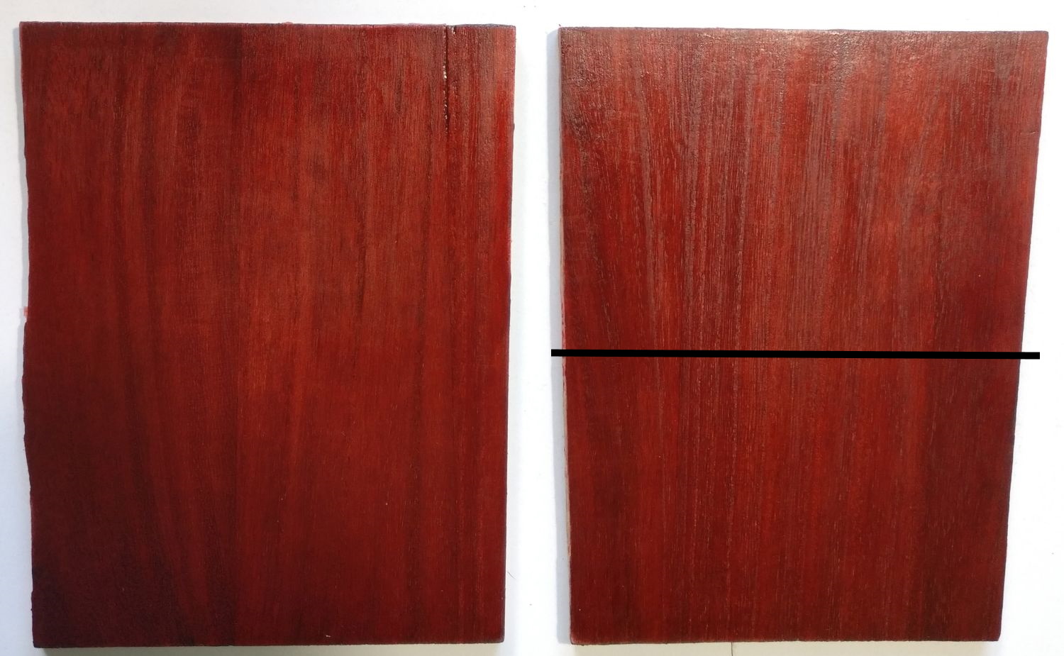 It's clear that the stain-first is darker. In the pics it looks like the AquaCoat-first board is just stained lighter. In reality it looks mottled. I tried to capture this with a closeup with mixed results...