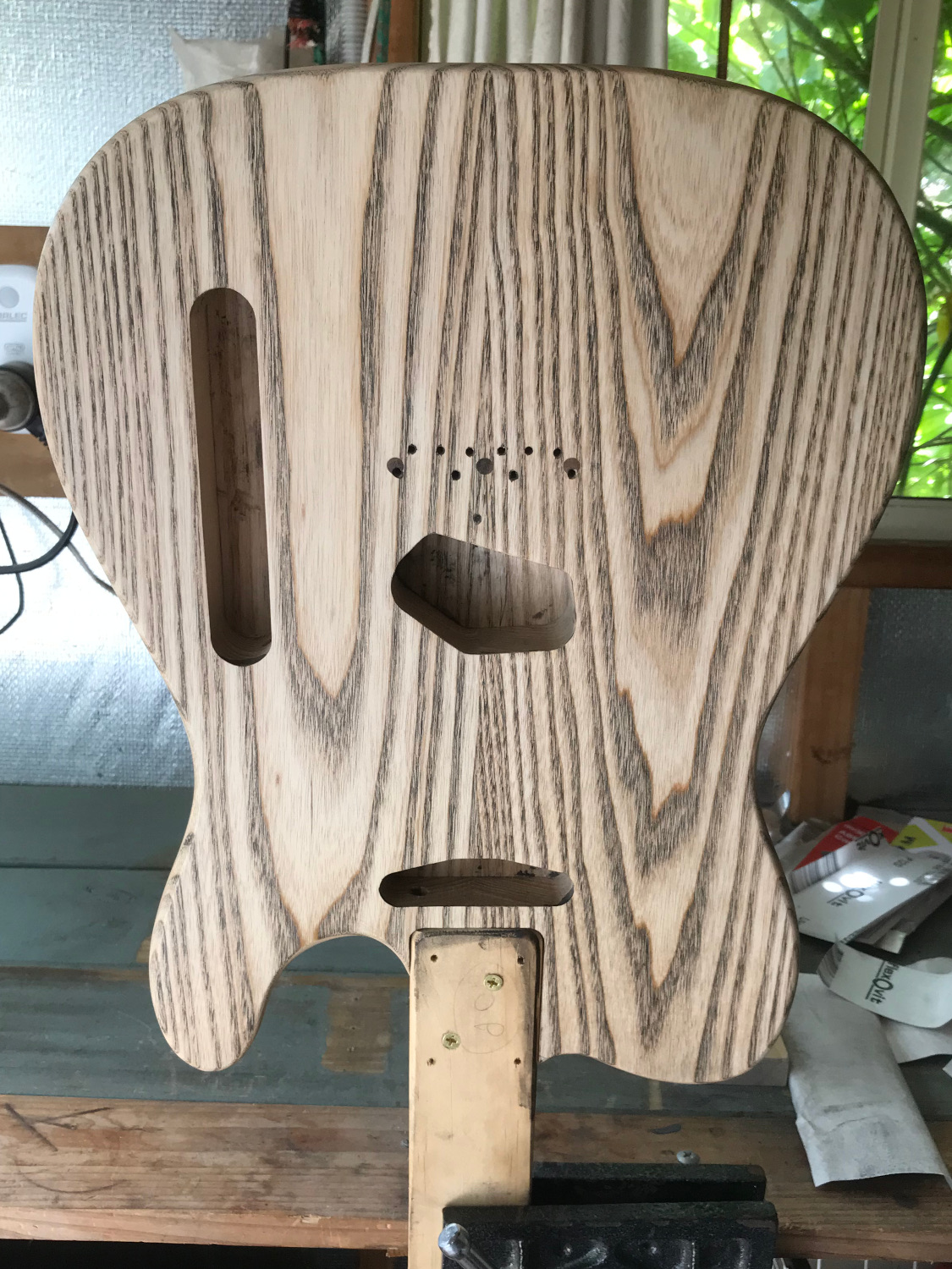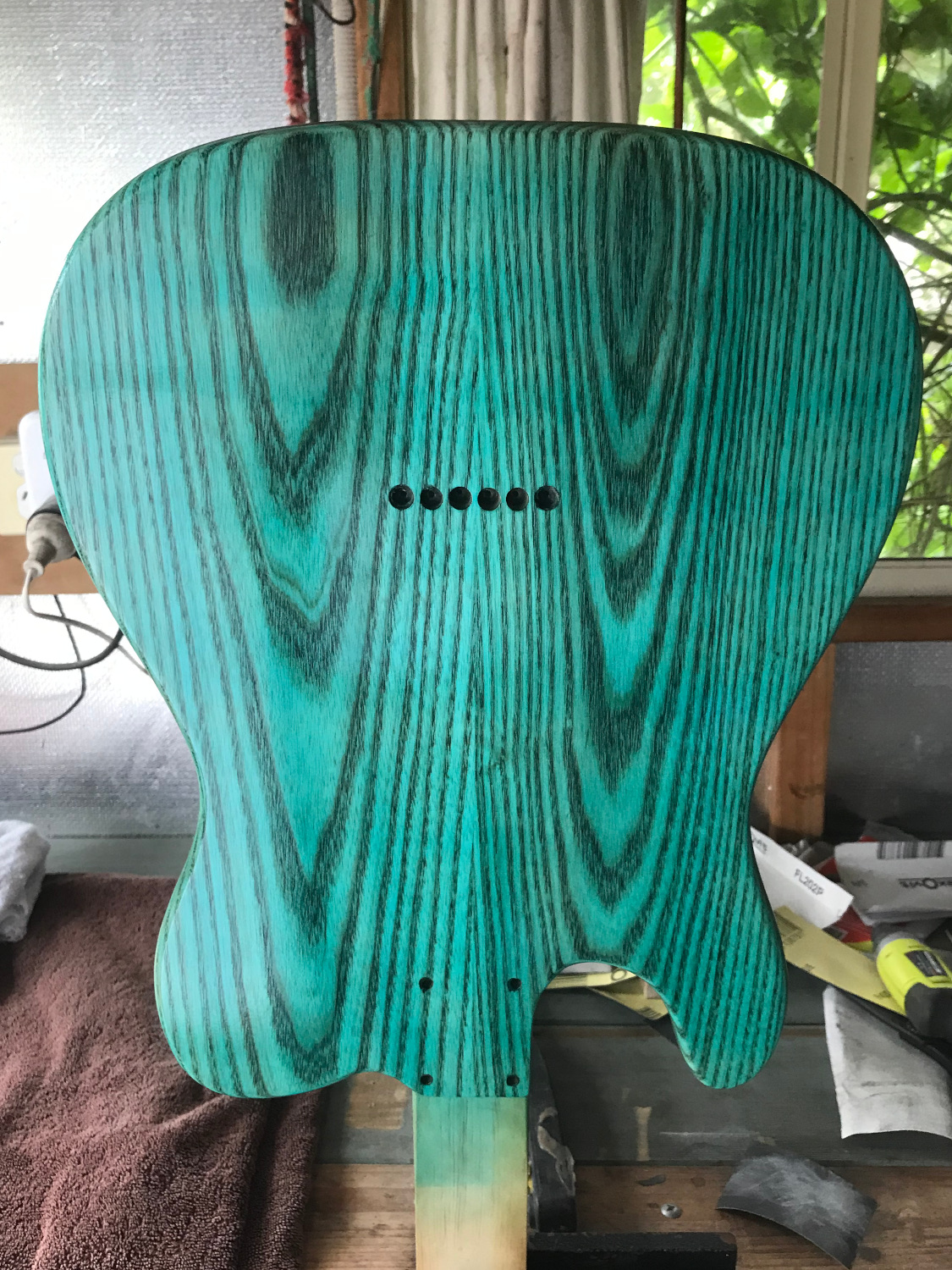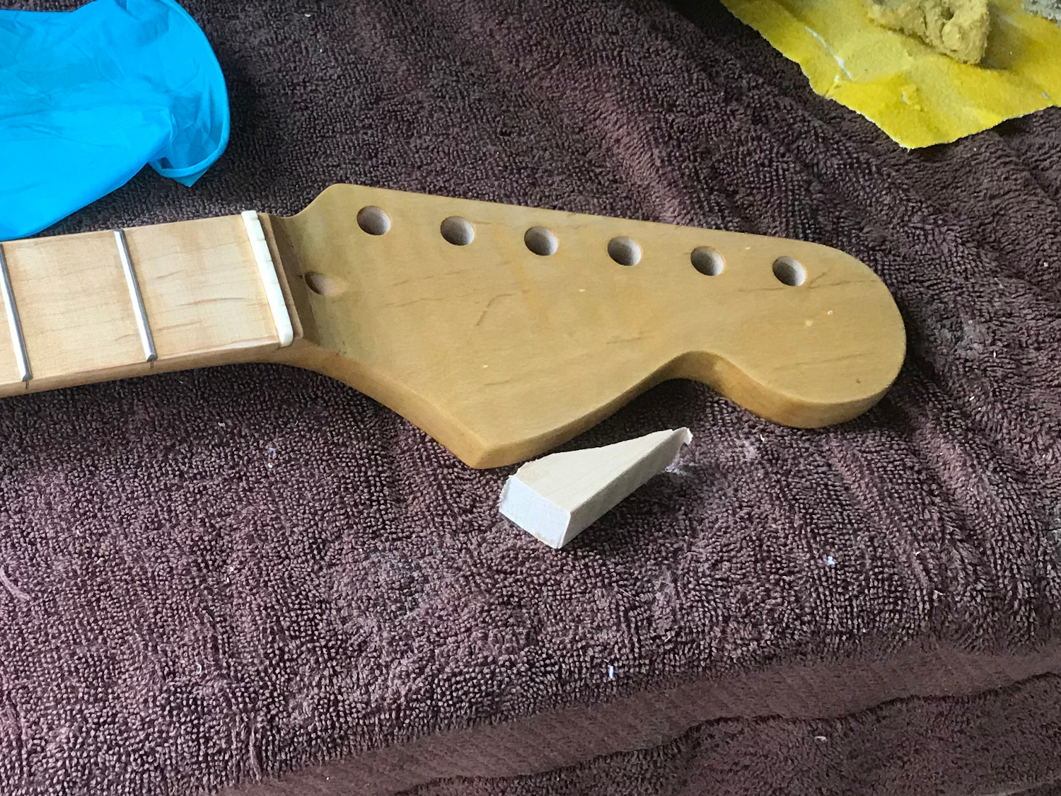 In the meantime, I've also shaped the headstock, stained the neck with dilute FW Golden Teak, and applied a couple of coats of Tru Oil. There's a natural maple offcuts there for comparison of the colour.