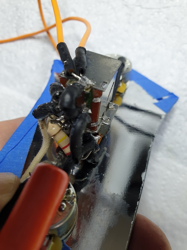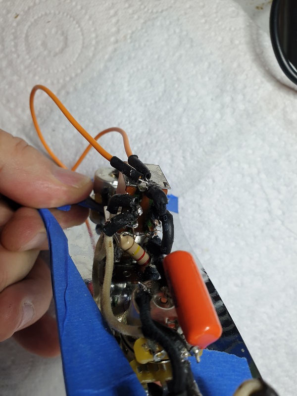 We have two orange plastic covered earth wires hanging loose on top. One for the pickup cavity and one for the bridge.