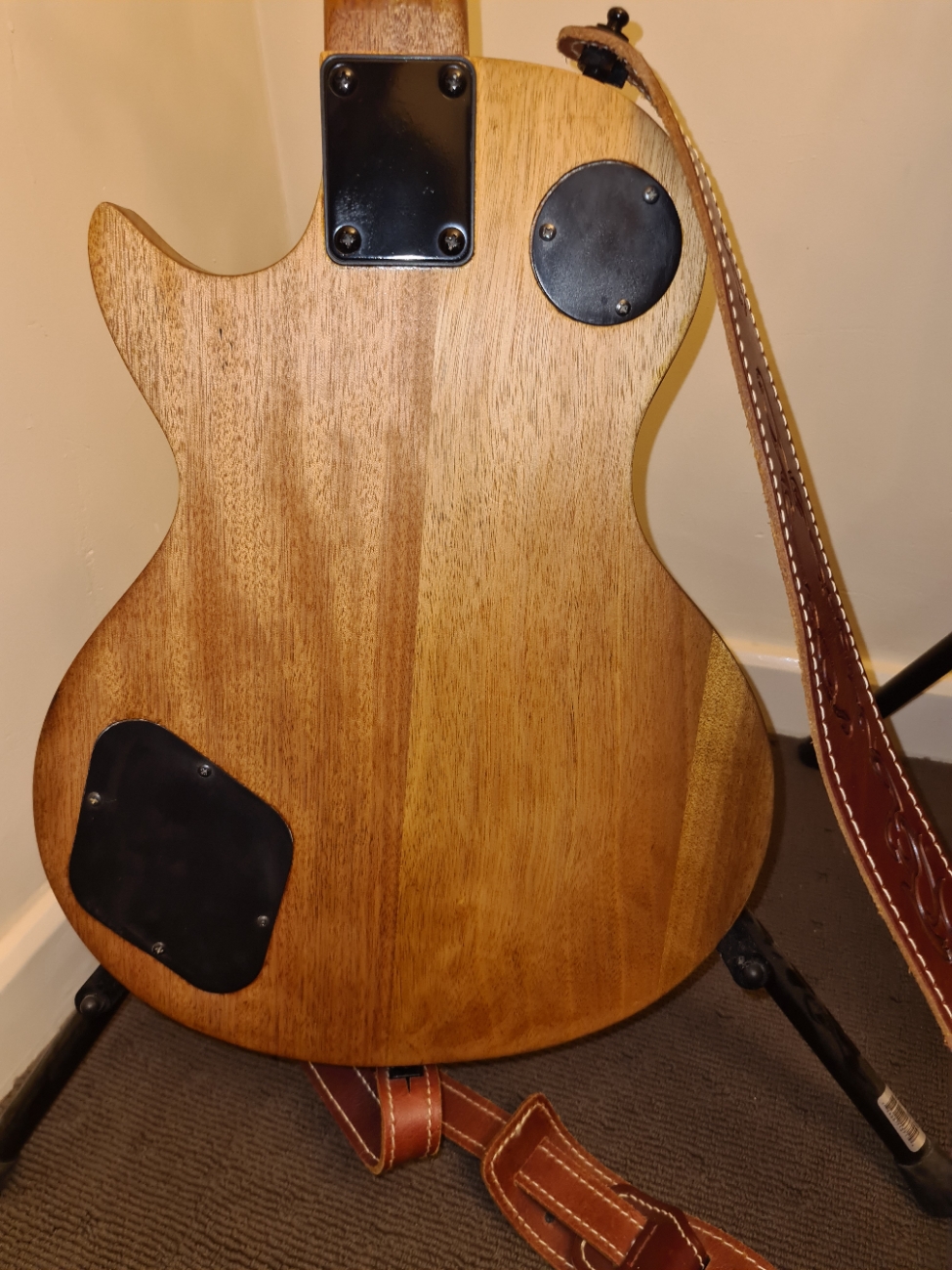 I love the way the guitar looks. It is sparse - not relict - kinda very slightly distressed - and the spalted top is just lovely (I had originally grain filled it and its really very smooth). There clearly must still be some finish remaining in the wood because it is nowhere near like a new kit 😀. Just minimal finish with a little shine on it in the right light.