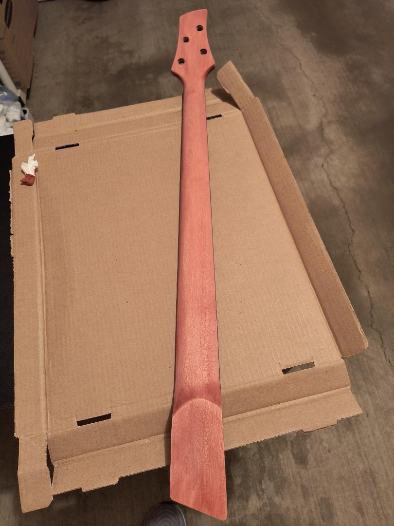 I followed the instructions for using the polymerized tung oil on the neck that I found on Highliner Guitars's Youtube video. I did a very light staining in cherry (first photo), and then sanded it down to only leave the grain. Initially, I thought I'd made a huge mistake by not putting a coat of sanding sealer on first, but I now like the look of the speckled clusters of grain that really came out. The second photo is after the 5th coat of oil.
