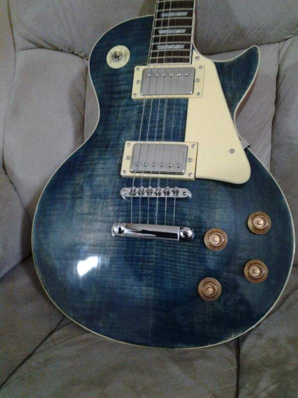 OK here it is... my first build, the LP-1M. Tryed my hand at doing a sort of blue burst on the top of the guitar with a nice mahogany dye on the back. Used Minwax timber dyes for both the blue and mahogany colour. Finished off the guitar with a good 15 coats of Tru-oil. Finish came up so well I didn't bother with cut and polish.