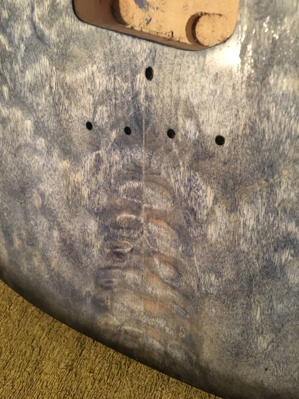 You can't see it the photo very well but there is a slight green tinge in some parts of the stain. I am assuming the colour of the wood is mixing with the blue from the stain. Again, I am pretty happy with this as it is adding to the water ripple effect.