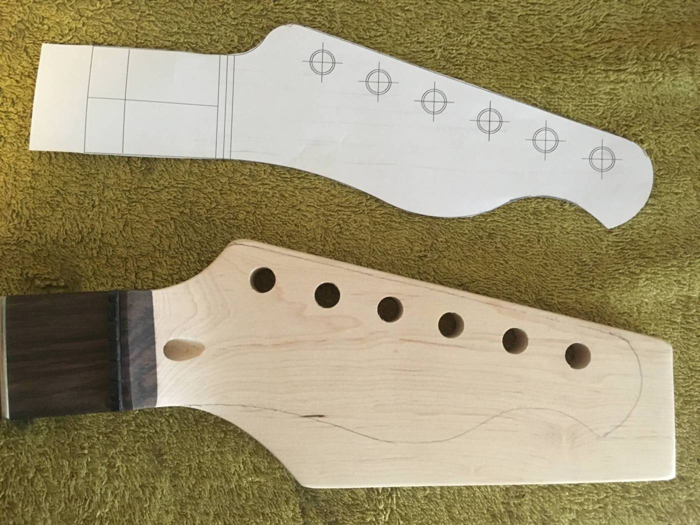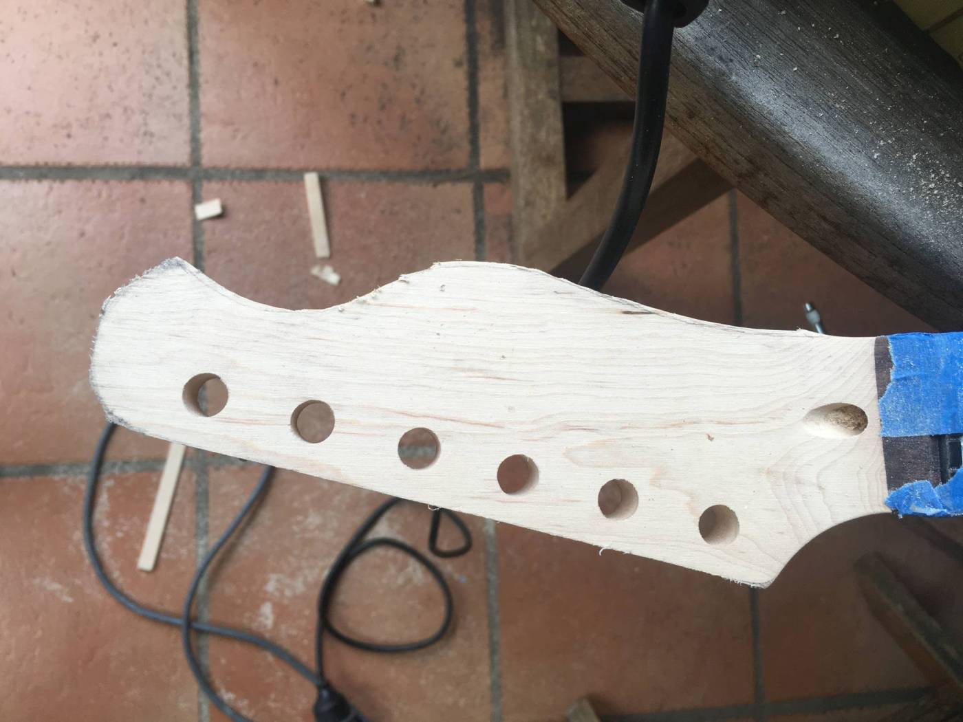 I wanted to do something different with the headstock when I started out, however I ended up with a shape pretty close to a standard Telecaster headstock.