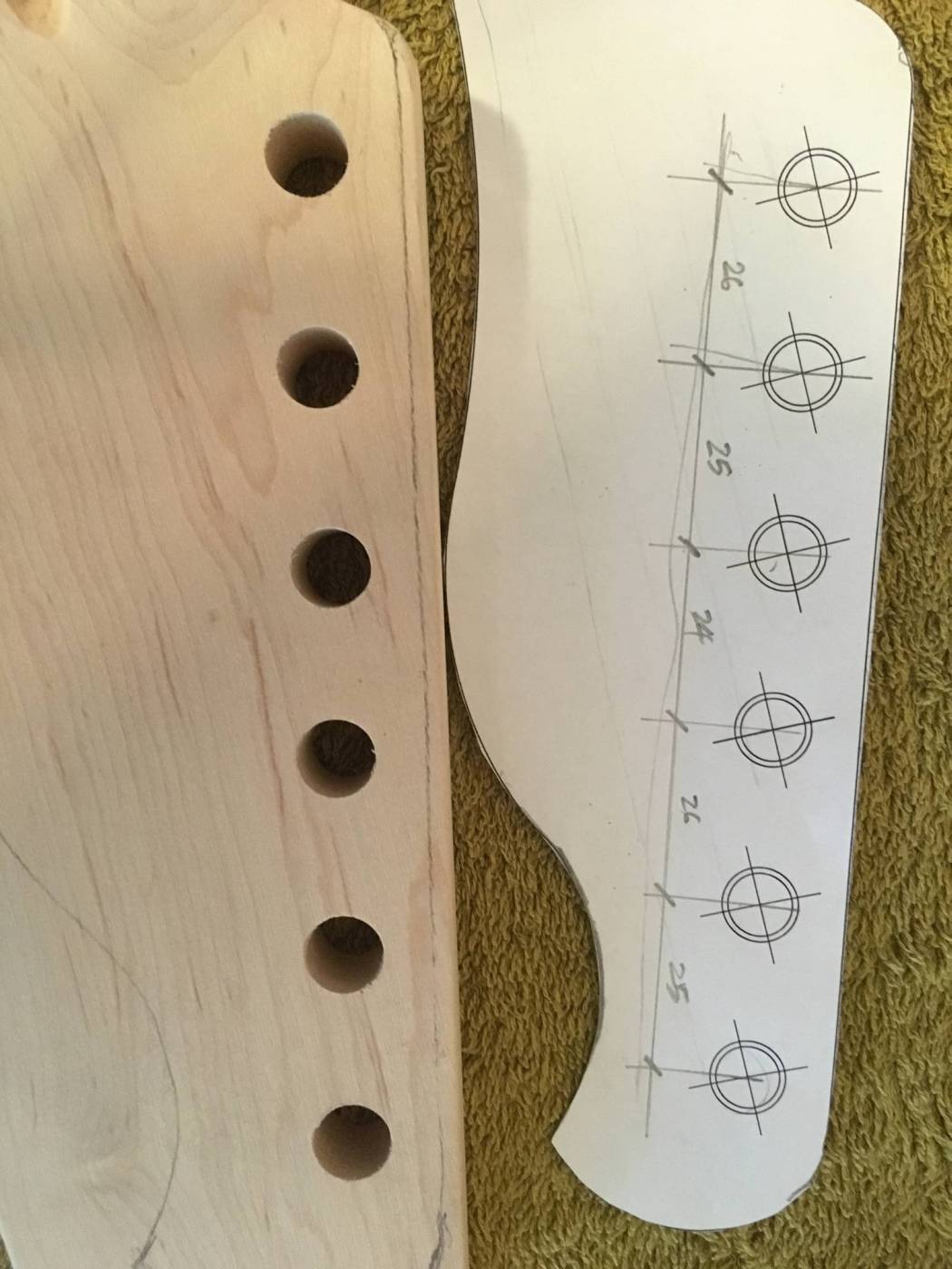 I decided that this would not be noticeable in the final product, so restrained myself from plugging the holes and redrilling. The perfectionist inside me is screaming but, we will have to live with that. I hope it does not affect the setup of the guitar and tuning later down the track.