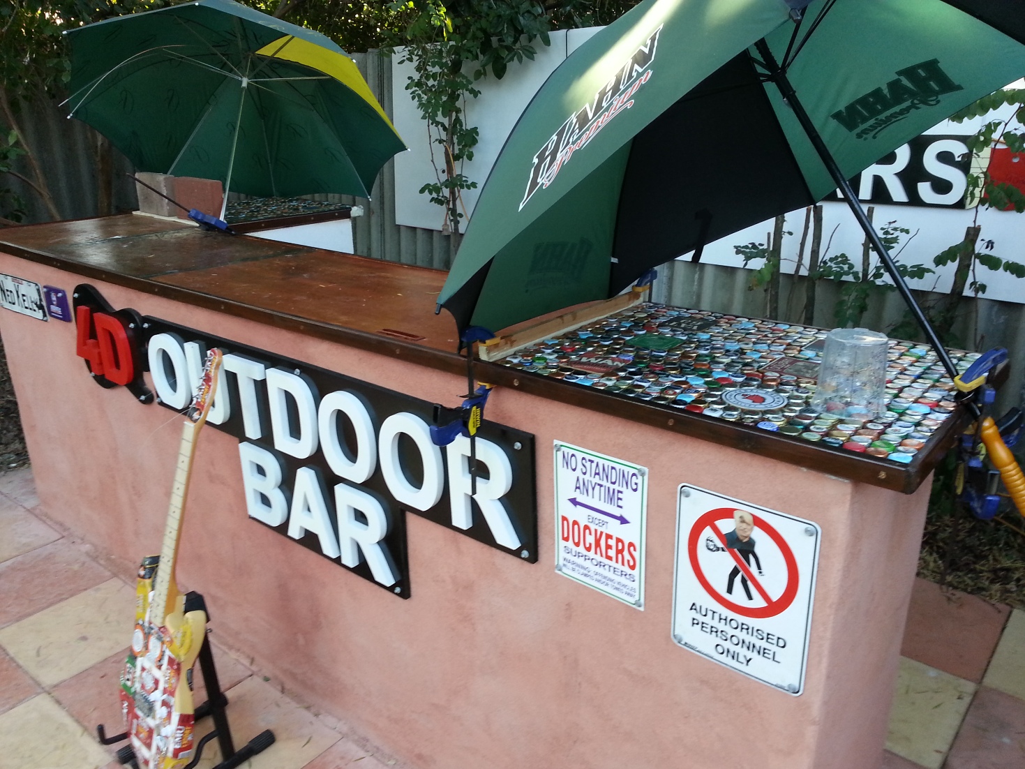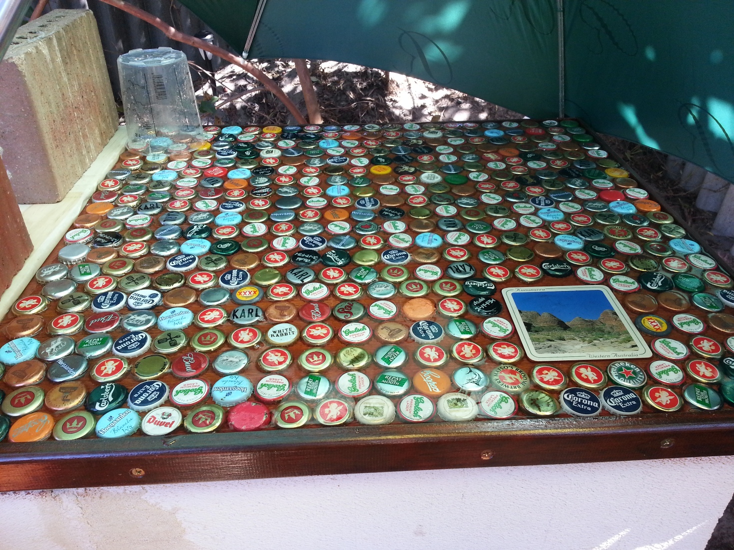 I've got about 1/3 of the bar top resin filled with bottle lids and coasters, it's a long process with the bar being under a tree that drops heaps of dead leaves but getting there. Getting good use out of 2 golf size umbrellas !