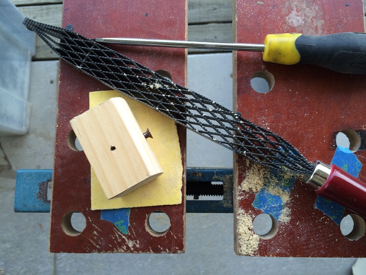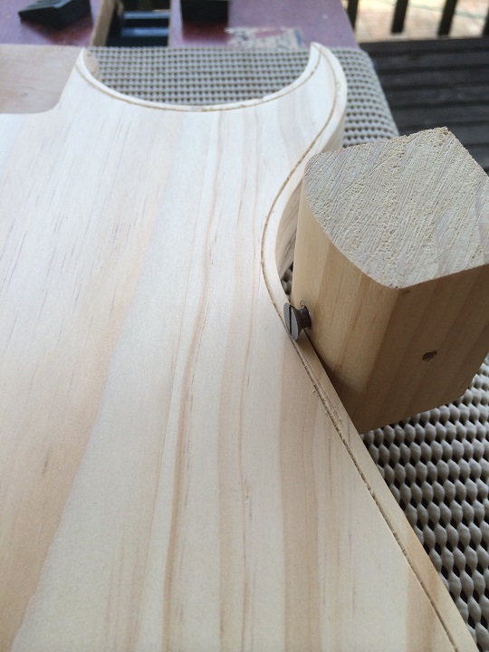 I needed to cut a guiding gouge so as to reduce tear out. I would dearly love to be able to afford to buy a descent gramil but even with one of those, with its flat surface, I was going to have a problem with the horn and the waist-line of a guitar. I found the answer on Google and made myself a “poor man’s” beading tool. I had to modify it by rounding of the surface to fit the contours of a guitar but it worked pretty well.