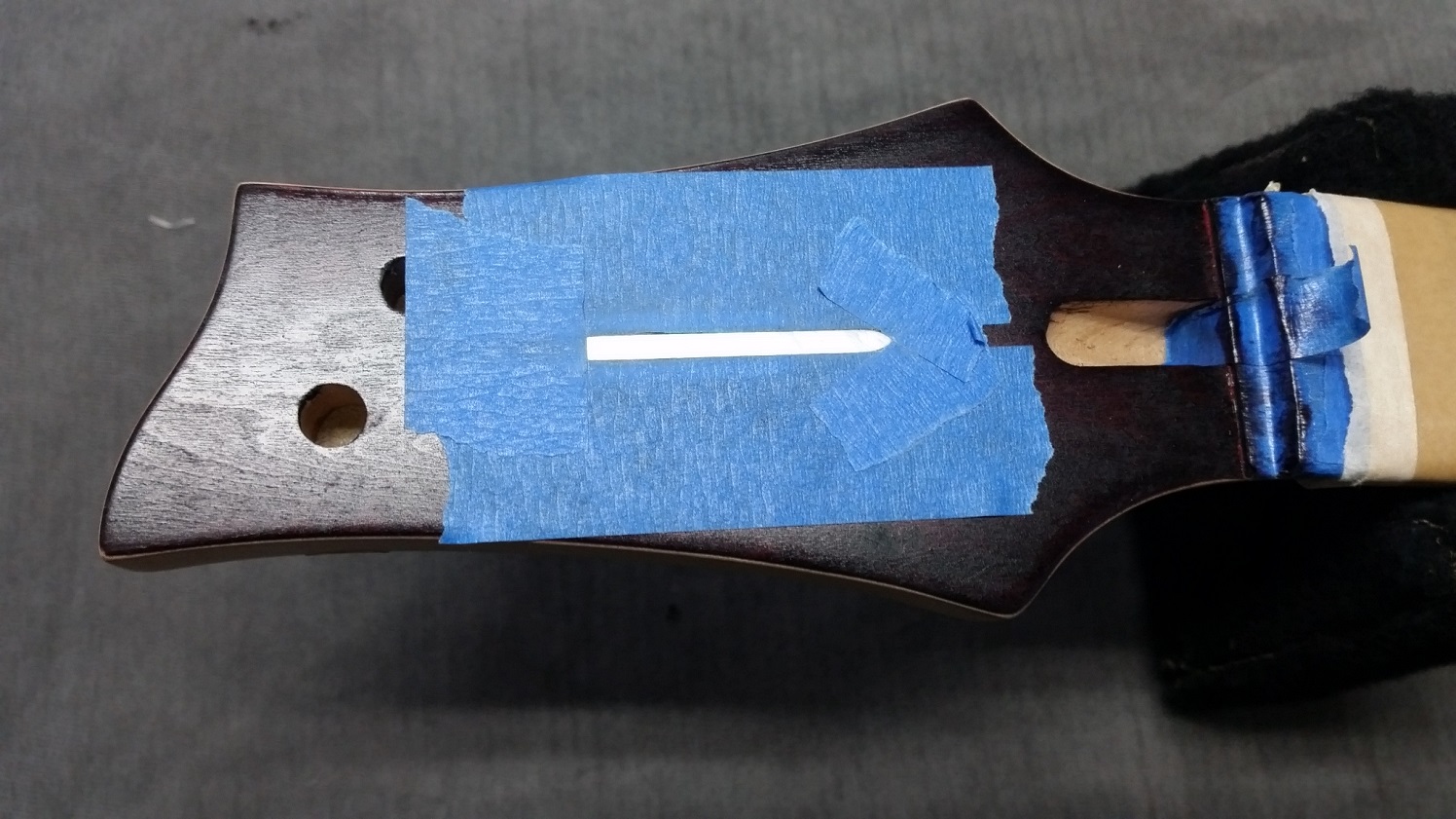 Progress has been a bit slow but have managed to get the colour on the headstock. Thought it might be a good move to tape up around the inlay pieces while sanding the stain off.