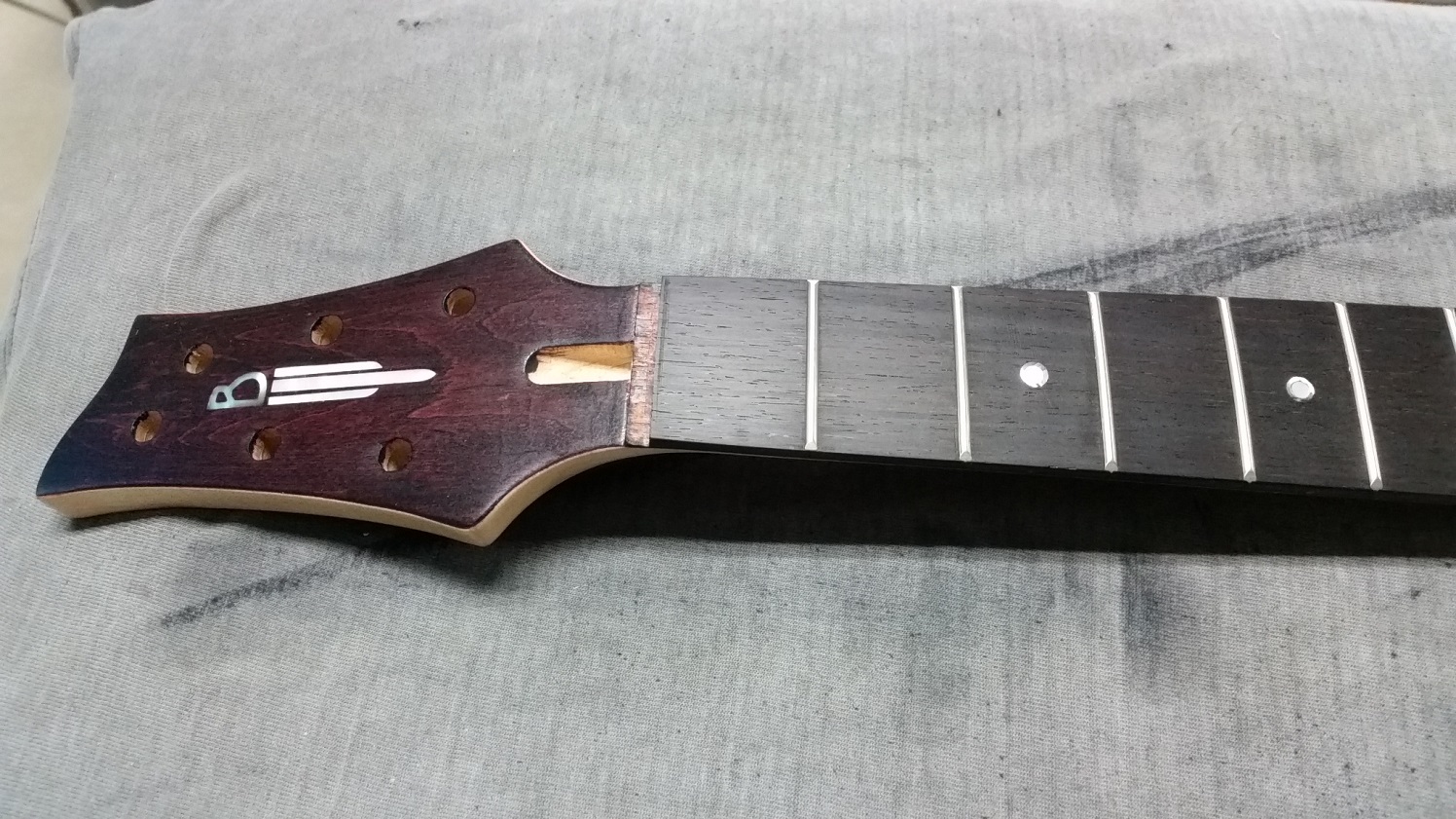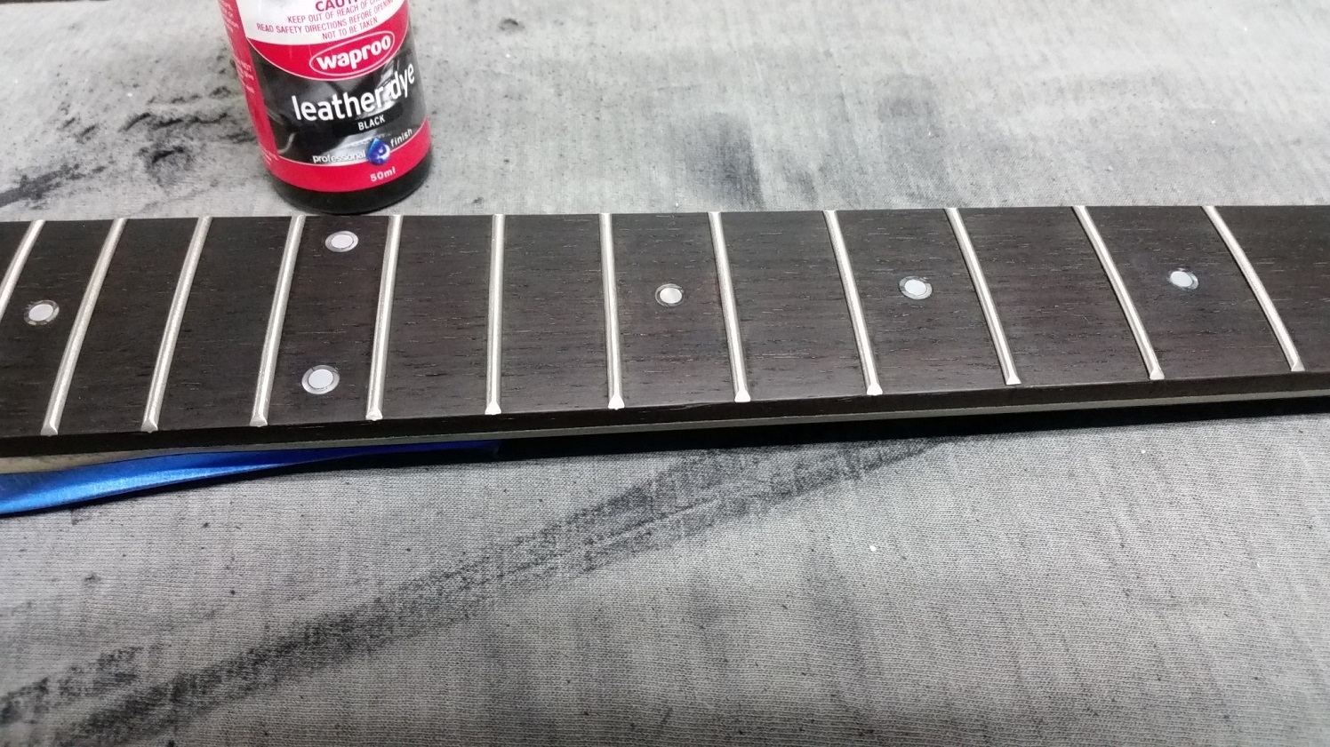 While there is nothing wrong with the fretboard, got the impression it was too light compared to the body colour and would look better if it was darker. So I 'ebonised' it with some leather dye. Taped off the rosewood and applied two coats of poly to the rest of the neck. Then masked off the poly'd area (maple), leaving the rosewood exposed and applied two coats of dye. Should mention this was after replacing the fret dots with white MOP dots surrounded by abalone rings (from Aus MOP supplies).