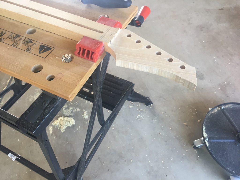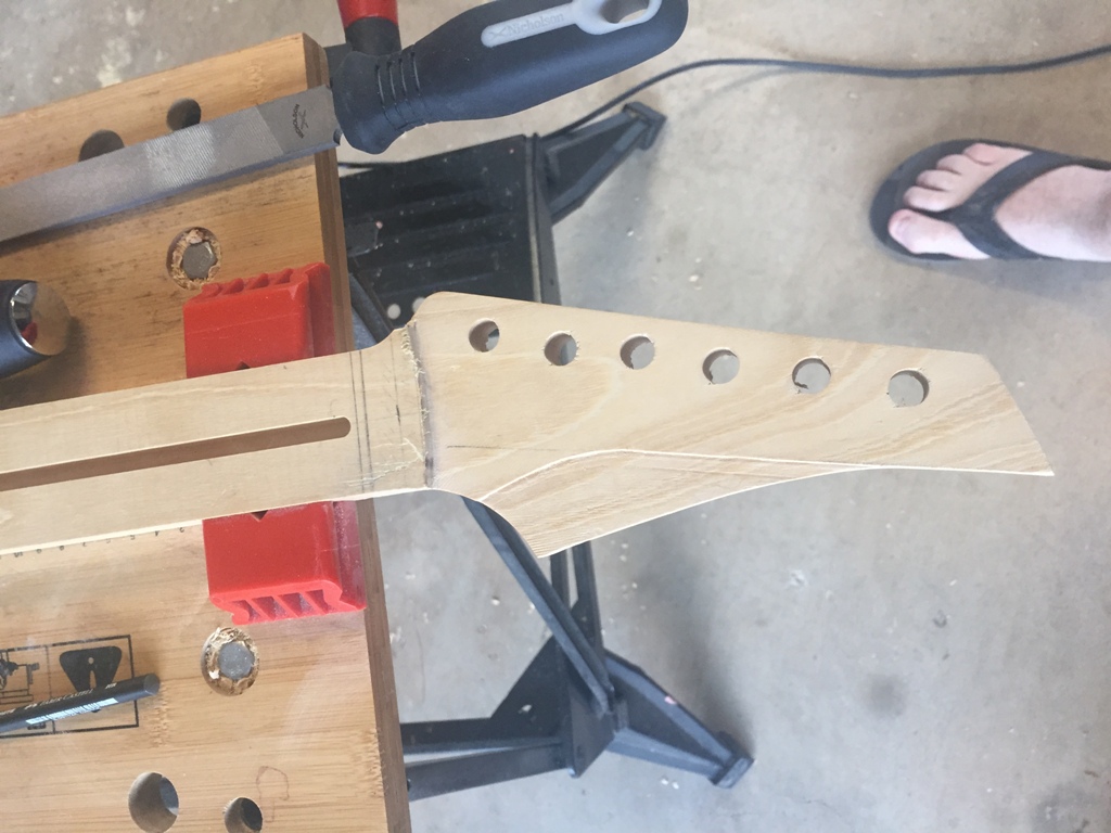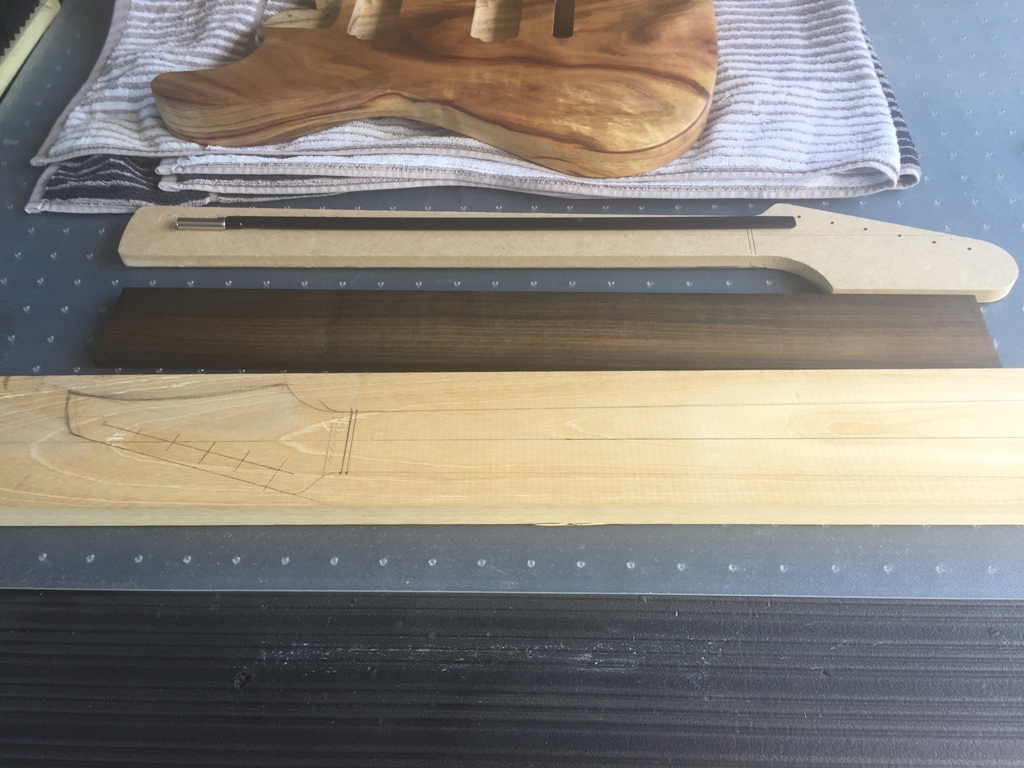 So today thought would have a crack at a neck for the build. Marked out with template and made own headstock design and then routed for truss rod (with a few hiccups) drilled the headstock holes and drilled one wrong. Drilled out to 10mm (will fix dodgy one tommorow).