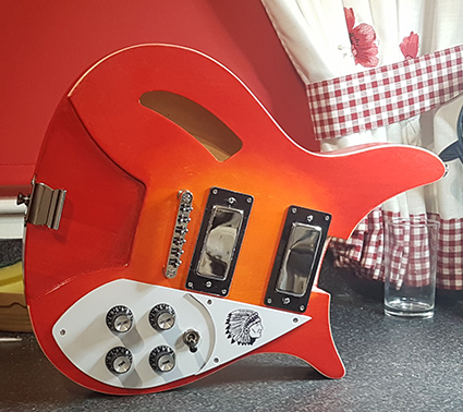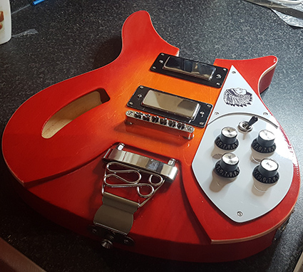 Cut the headstock to shape. Had a bash with staining it but the red was too red so it's all coming off tomorrow.