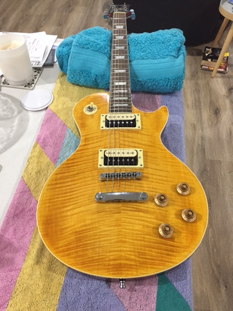 Hey Guys, here are a few photos of an LP1 kit that my son and I had a go at making together, he's the guitar player, i just sit back and watch him play, wishing I could! Its our first go at making anything like this and we are pretty stoked with the way it turned out! We started by aligning and gluing the neck follwed by sanding and staining the body with Coolangatta gold DingoTone. Next we sanded and primed the rear before adding a custom copper mix I made using the colour code off of an old Yamaha motorcycle tank. I then cleared the body with Automotive 2-pac clear and wet cut and polished it to get the finish we wanted. We have since added some Slash signature Seymour Duncan Zebra pickups, and Ive got to say it sounds amazing! Such a blast making it, wont be the last. Click image for larger version.