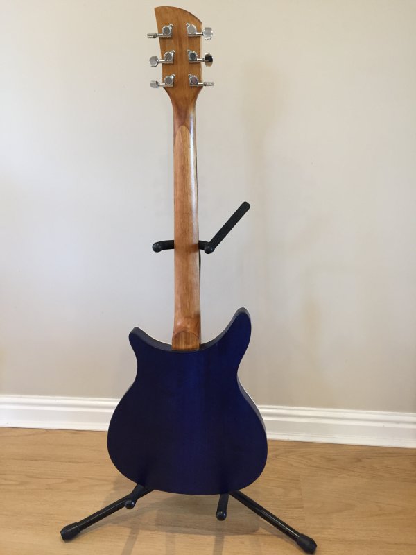 Good first build that looks pretty close to Riccy Midnight Blue. Hard colour to get right, particularly on what looks like basswood with just a hint of grain poking through. Would have liked to see back of neck in same colour as I always reckon set neck guitars look best done that way. Bonus points for making your own truss rod cover and personal logo.