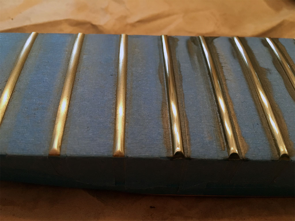 Here's a shot with a few frets on the left after removing the Tru-Oil with a maroon fiber pad and a few dremel-polished with Red Rouge on the right: