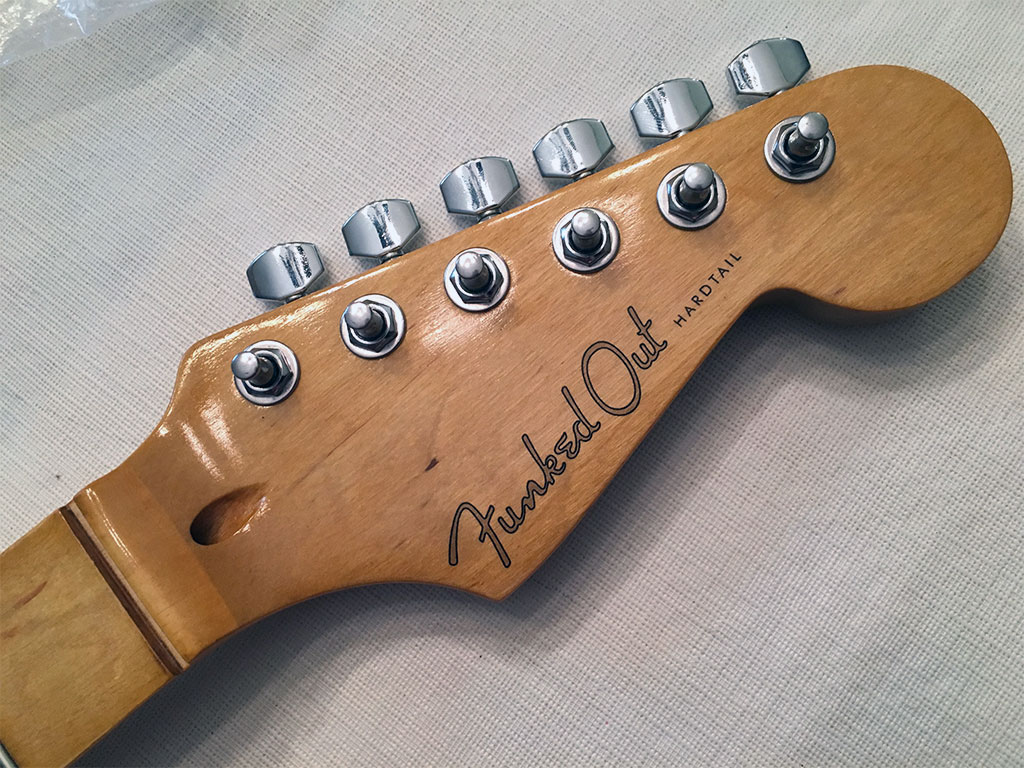 Ready to apply a waterslide decal on the headstock.