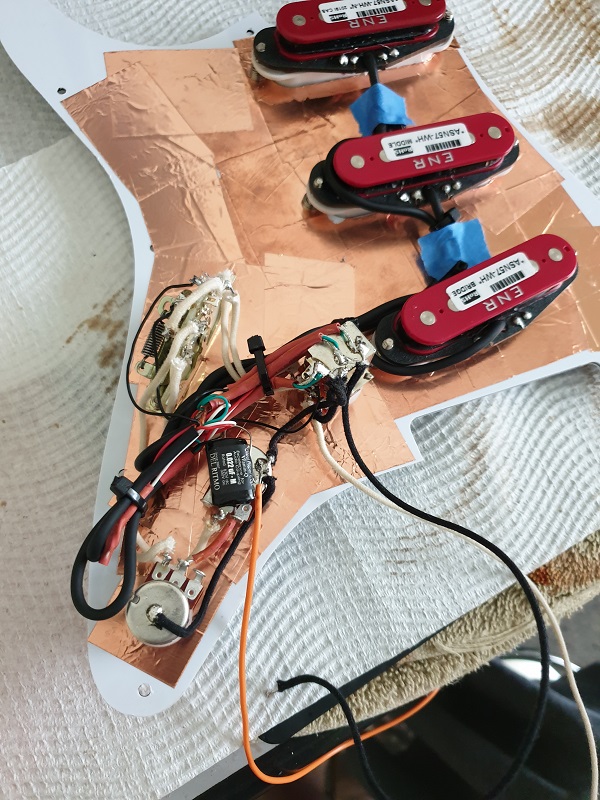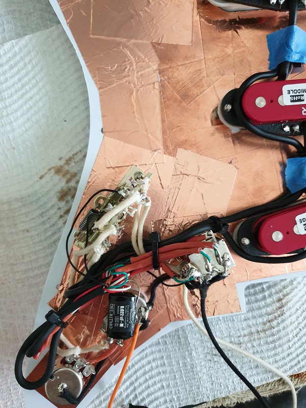 I def concur with Simon about that type of factory p/g shielding. On more recent import p/g's the material is more like a "metallic paper" sticker. IME if it has a flat/matte finish to it, it's generally rubbish and poor conductivity. The shiny "foil-like" material is a bit better, but I use quality copper tape with conductive adhesive, and go right over the factory stuff just because.
