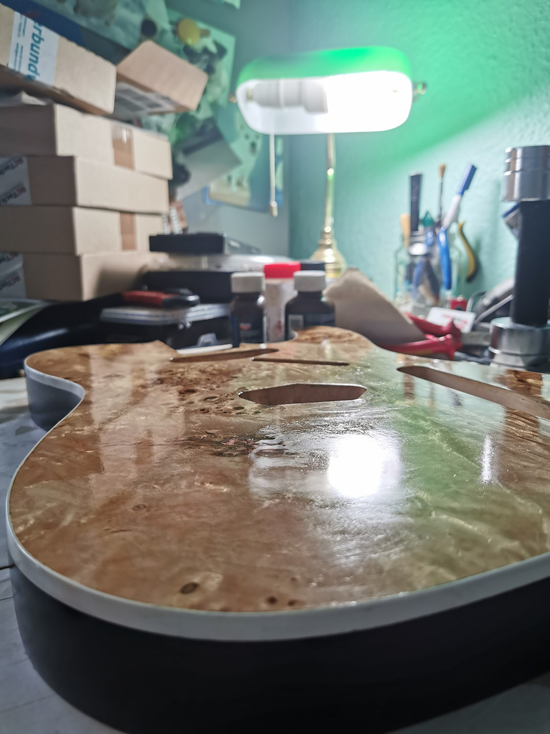 And the pickguard is finally lacquered and cured: