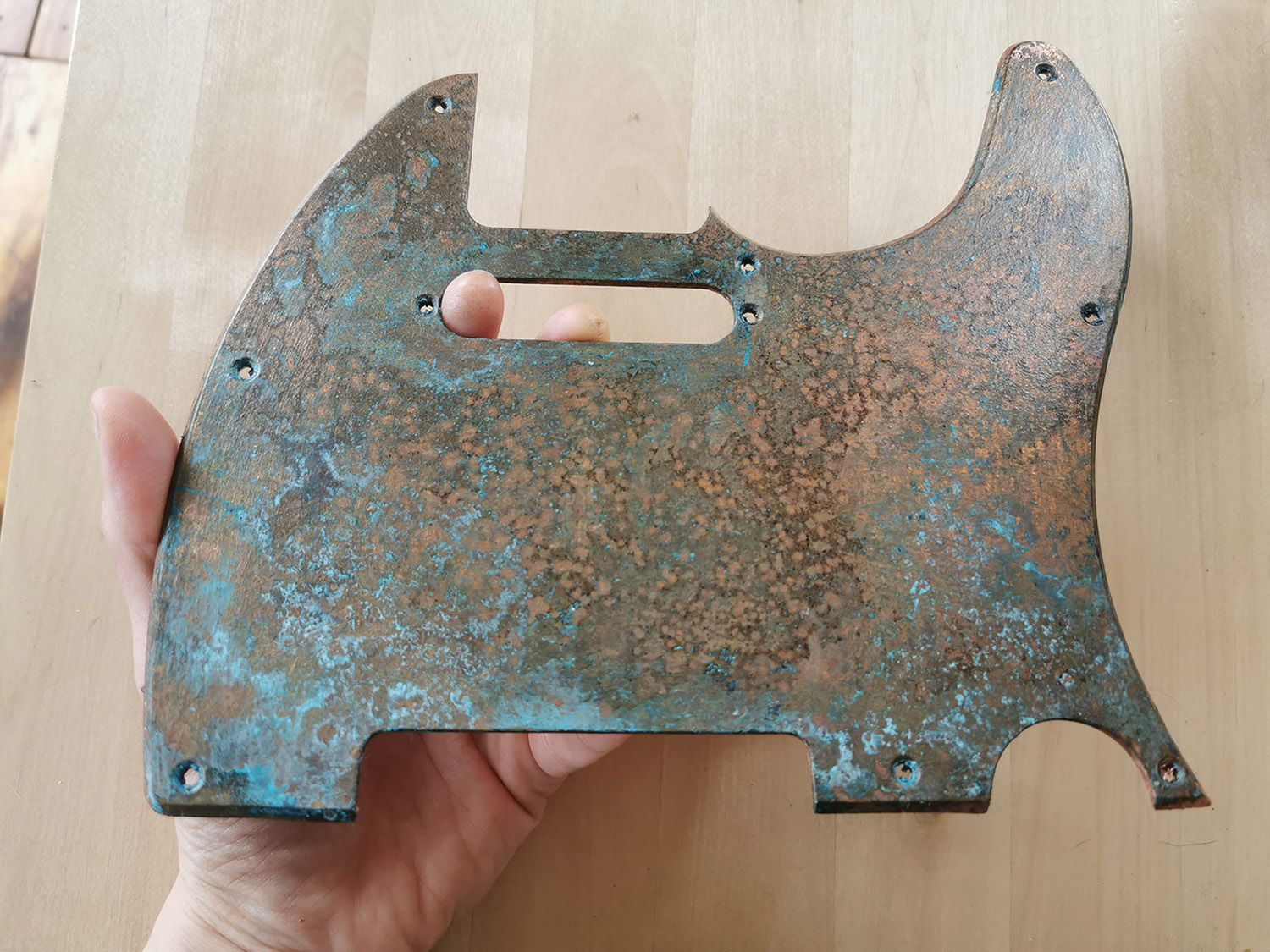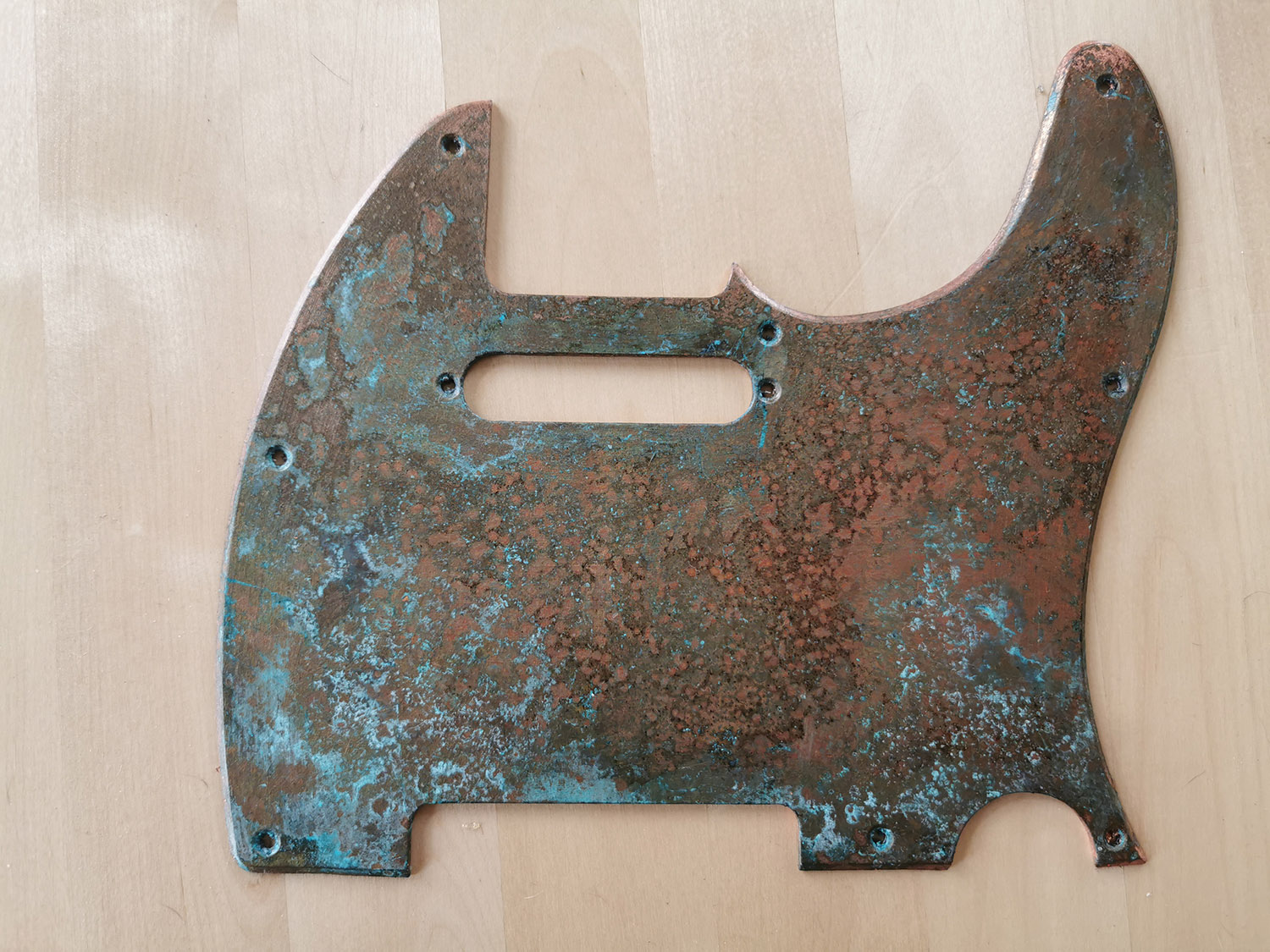 Due to the irregular surface, it has more of a matte sheen instead of a gloss look. I'm torn here... I don't think the rusty parts should be shiny, but I also don't think the few non rusted spots should be matte. But I guess as it's only copper plated, there is no real solution, as I can't just buff up the copper, it would probably be destroyed. So lacquering it was the only option... besides buying a sheet of copper and just making my own pickguard (which I will do for the next build for sure ;-) ).
