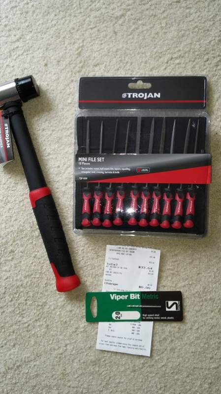 Found these ten small files, a plastic head hammer....black oneside and a see through yellow on the other.....and a small drill bit...2mm....all for $33-64. Love the little cover for the multi sized and shaped files....think that was $15-00 or so.