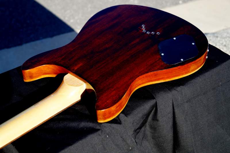 Top is fw black sanded back, then Danish oil then semi gloss wipe on poly. Back is a golden stain with semi gloss poly. Neck is tru oil, water slide decal logo and wax transfer neck logo finish her off. Click image for larger version.