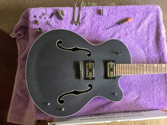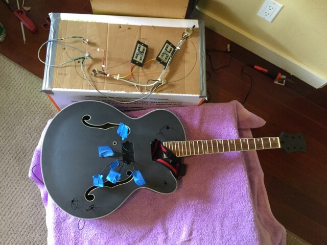 Electronics checking out, I ran wires thru the body and out the pickup hole. Attached the corresponding wires to jack and pots and fed the whole thing back thru the pickup hole to their new homes. I was able to use my youngest son to stick his whole hand in thru the neck pickup hole and line up the master volume and the pickup selector, making it a family affair.