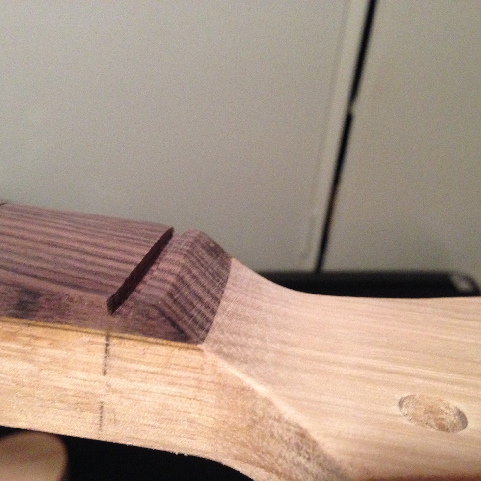 After that was done i had to notch out the end of the fret board to fit over the spoke, Click image for larger version.