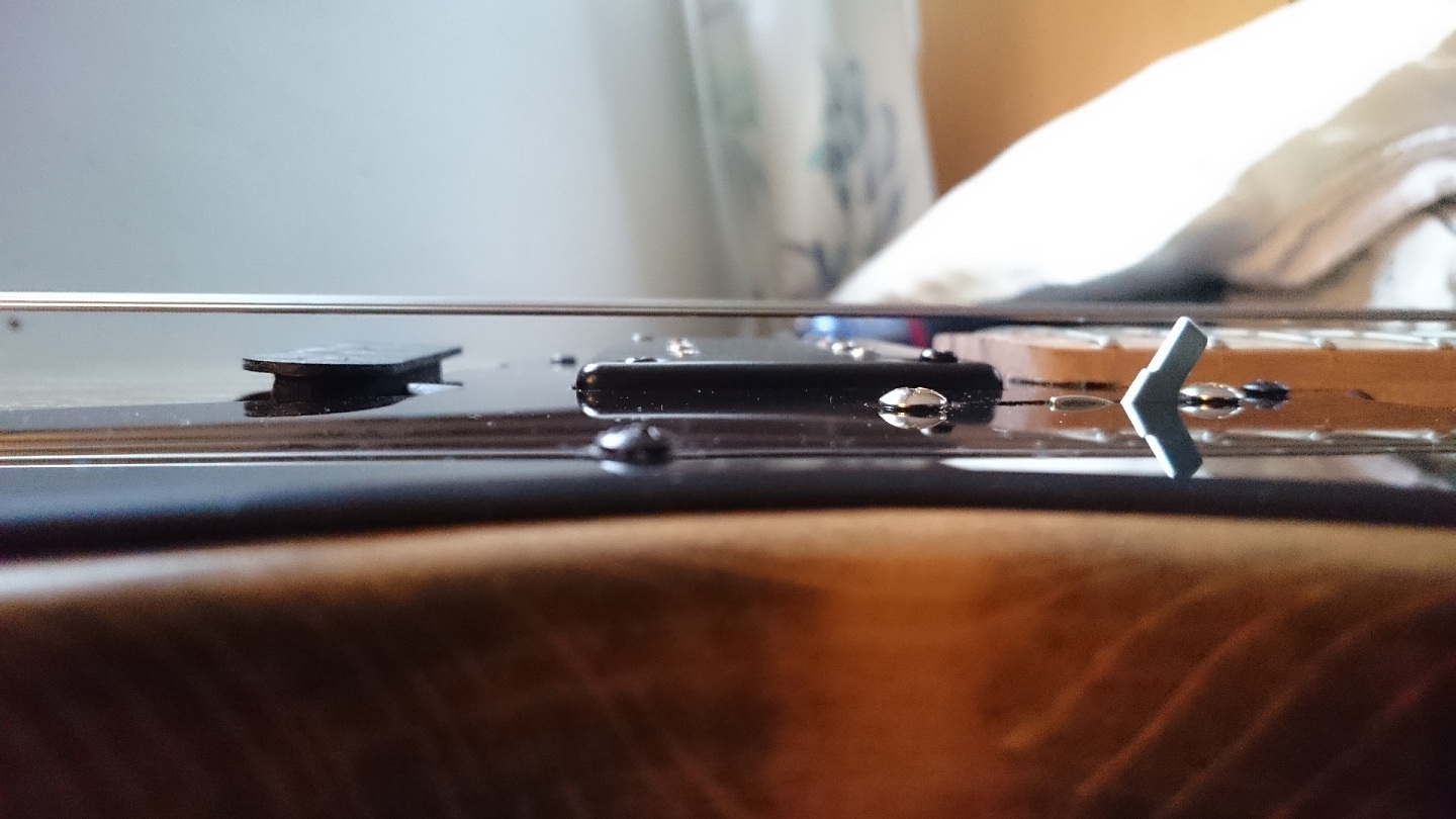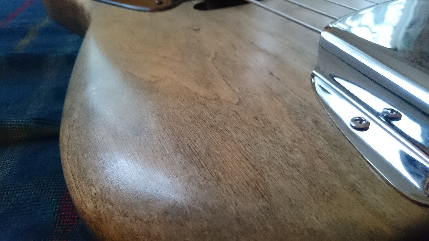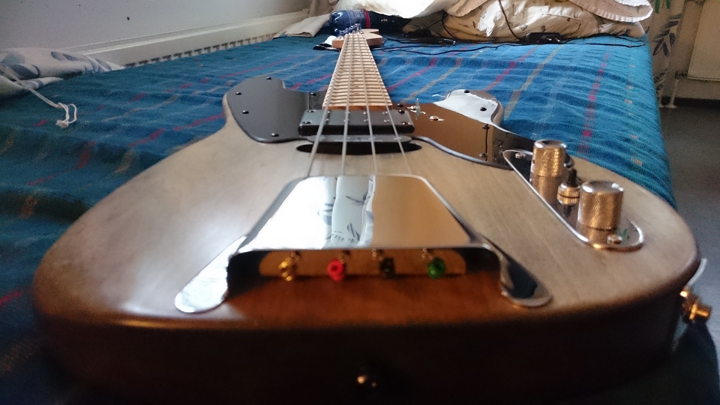 My plan is to make the truss rod cover from the same wood I have left from the body and finish it the same way to put some of the color on the laquered headstock which is just a bit pale compared to the body. Also I have to figure out a way to use some wood on the knob for the 4-way switch. Other than that it's finished.