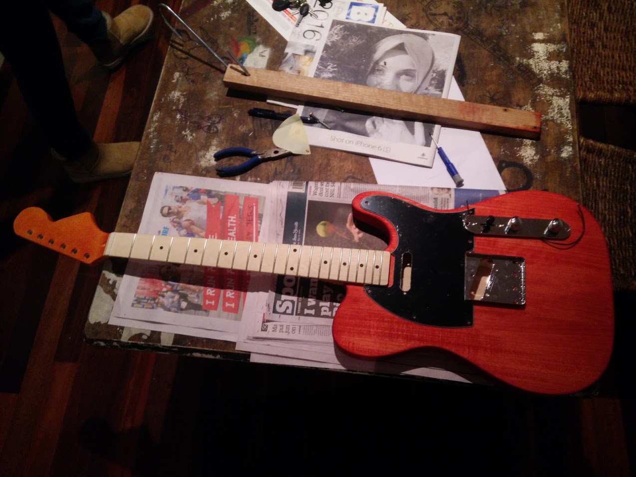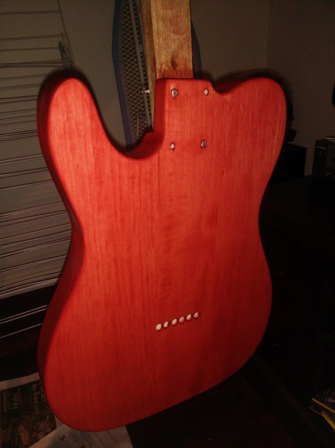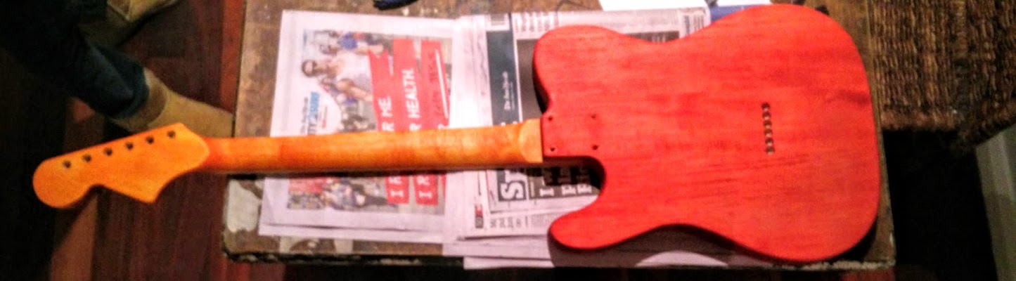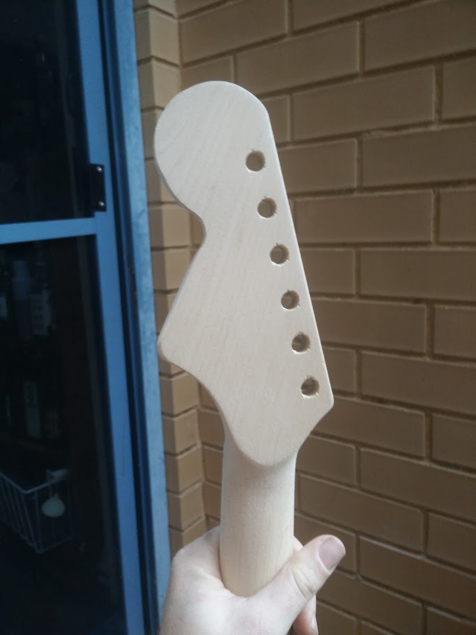 Update #1 - headstock shaping. Tried to go with a teledeluxe style headstock shape. Used the drawings linked in the "How to build" forum as a guide. I got the general shape cut with a coping saw, then used files to hand shape it. Pretty happy with the result in the end.