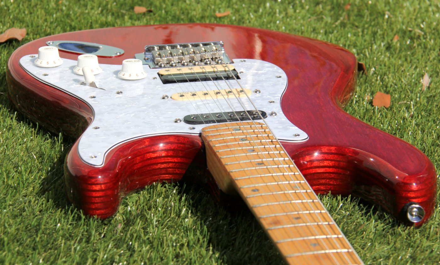 The body was sanded back to wood, adapted to replace the bridge single coil by a humbucker, dyed red with colortone, and finished with gloss wipe on poly.
