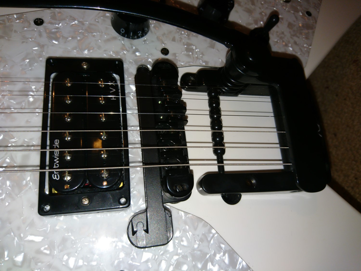 And probably most importantly, I'm not running the strings under the standard rollers of the bridge any more. I had a suspicion this might end up being the case when I first installed the X-Trem, because it was so close to the bridge, but over time I was having pretty rubbish tuning stability with the trem. The string was breaking at too much of an angle in that part of the string, so it's just running straight from the base of the trem to the bridge itself, and it's immediately holding tune much better.