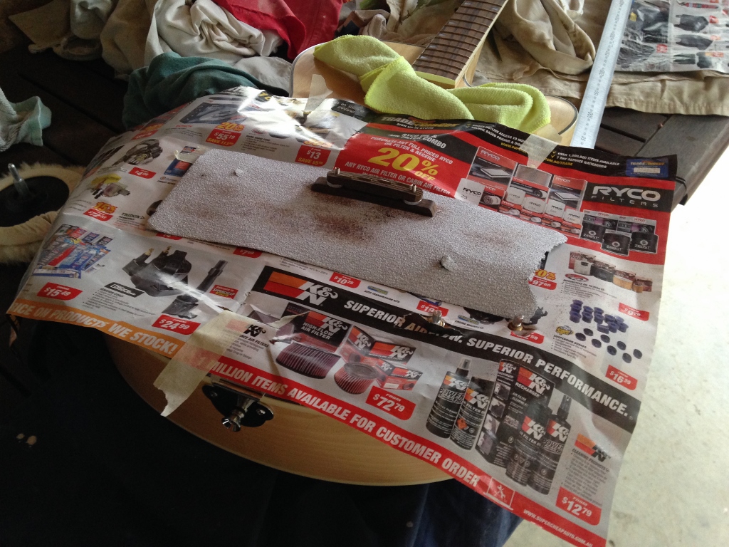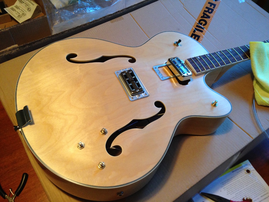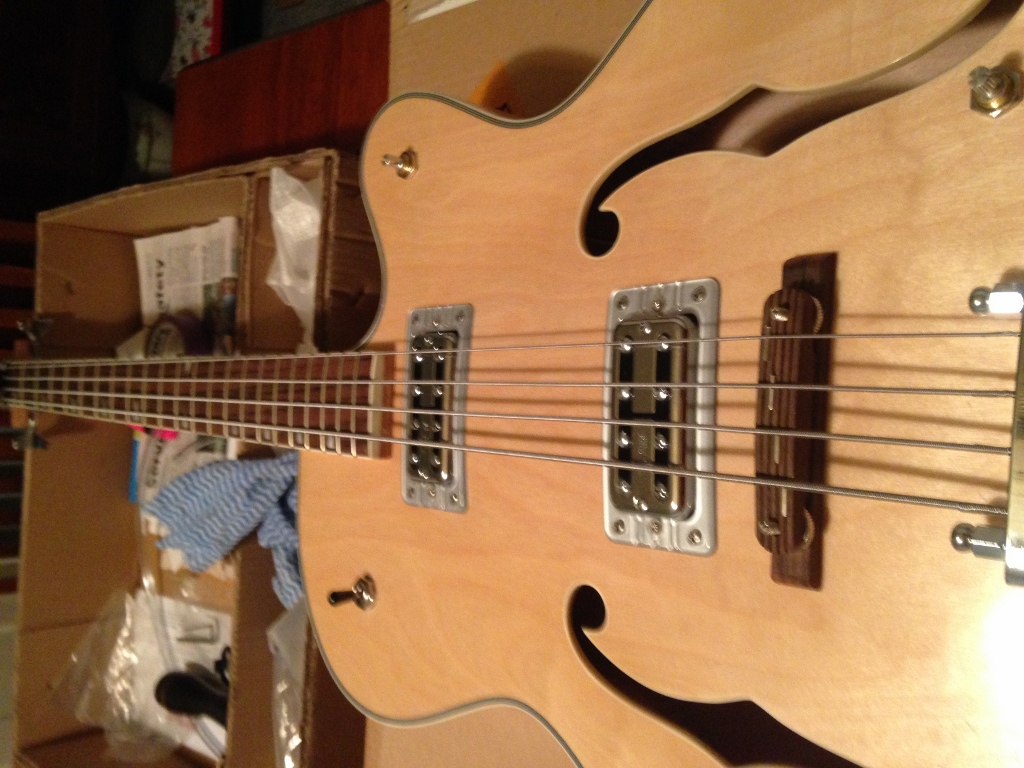 Time to wire it up. I placed a piece of stiff paper over the guitar top and carefully felt where the holes are, pushing a pencil through to give me a template of the component locations. Then positioned the components through the holes in the paper. Then sorted out the wires that came with the kit for best fit. There is no consistent colour coding with the wires, but tried to keep black to earth, white live as much as I could. Soldered wires to components, threaded earth wire from tailpiece to control cavity. I found this web link VERY useful: https://www.youtube.com/watch?v=jxr9E56qyjg parts 1 and 2. Bought tubing and dowel from hardware shop $8 well spent and reusable, as I found out later. Followed video instructions and they worked a treat. Here I encountered a problem with the wires. They regularly broke off at the solder joint. Note to self: use your own better quality wire to build the harness. Also, allow plenty of extra length. Wired up and now start trouble shooting. There was lots of hum that rolled off with the tone knob. This was the first time I found broken earth wire. Pull out offending pot and resolder. Not easy in a hollowbody. Luckily was the tone pot so close to f hole. re assemble. No output. Broken wire number two remove tone pot, etc. Broken wire number 3, live to output jack. remove, etc, replace. I added length to a couple of wires and taped them together for stability when manouvering. All is in now and working hopefully it will not need to be disturbed again. I also eliminated the hum by throwing away the lead cable that came with the kit and used a quality cable. I am thinking I will not bother with the strings that came with it either. I am accumulating enough surplus parts to build another bass!