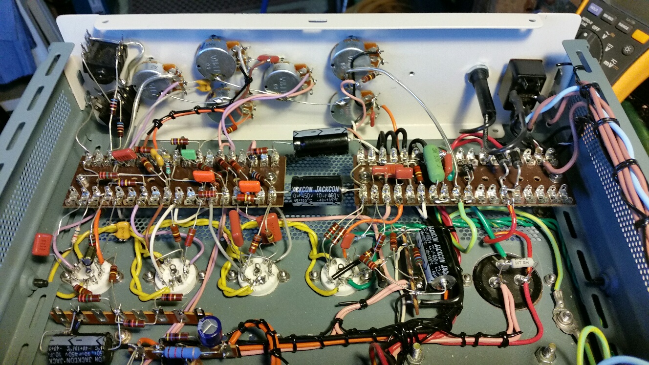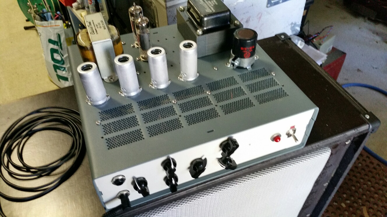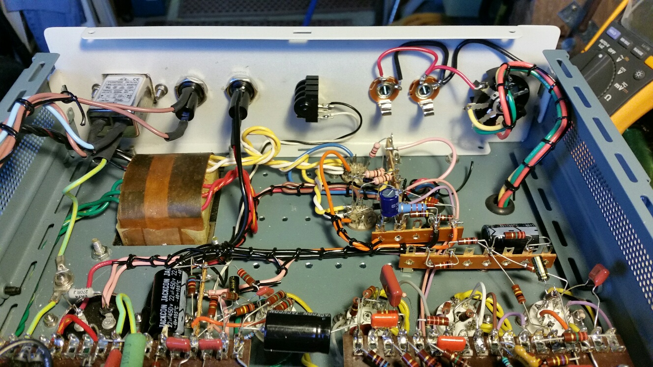So it is complete and it works.... I will need to re-visit the EL84 bias issue and cool the tube down to less than 12W plate dissipation at idle by fitting a larger cathode resistor once replacements arrive from RS-online.... but there is no hurry....