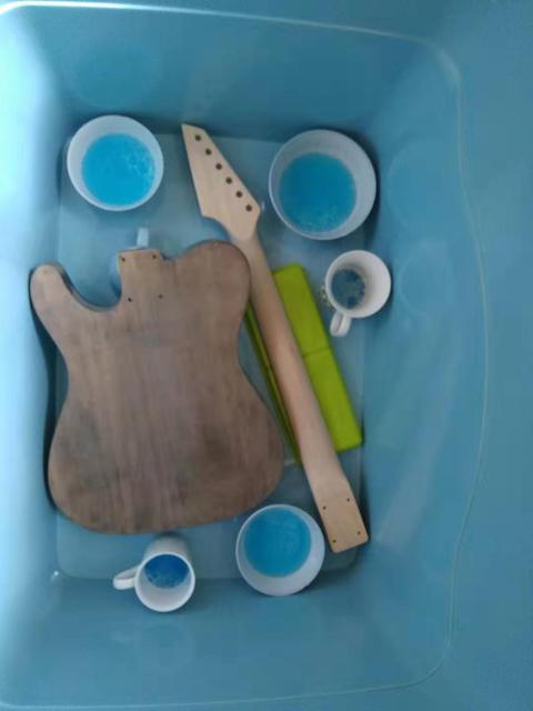Grain filling and glue removal is done. Now it's into this big plastic box with cups full of Windex for an ammonia stain. I'm very curious to see the effects.