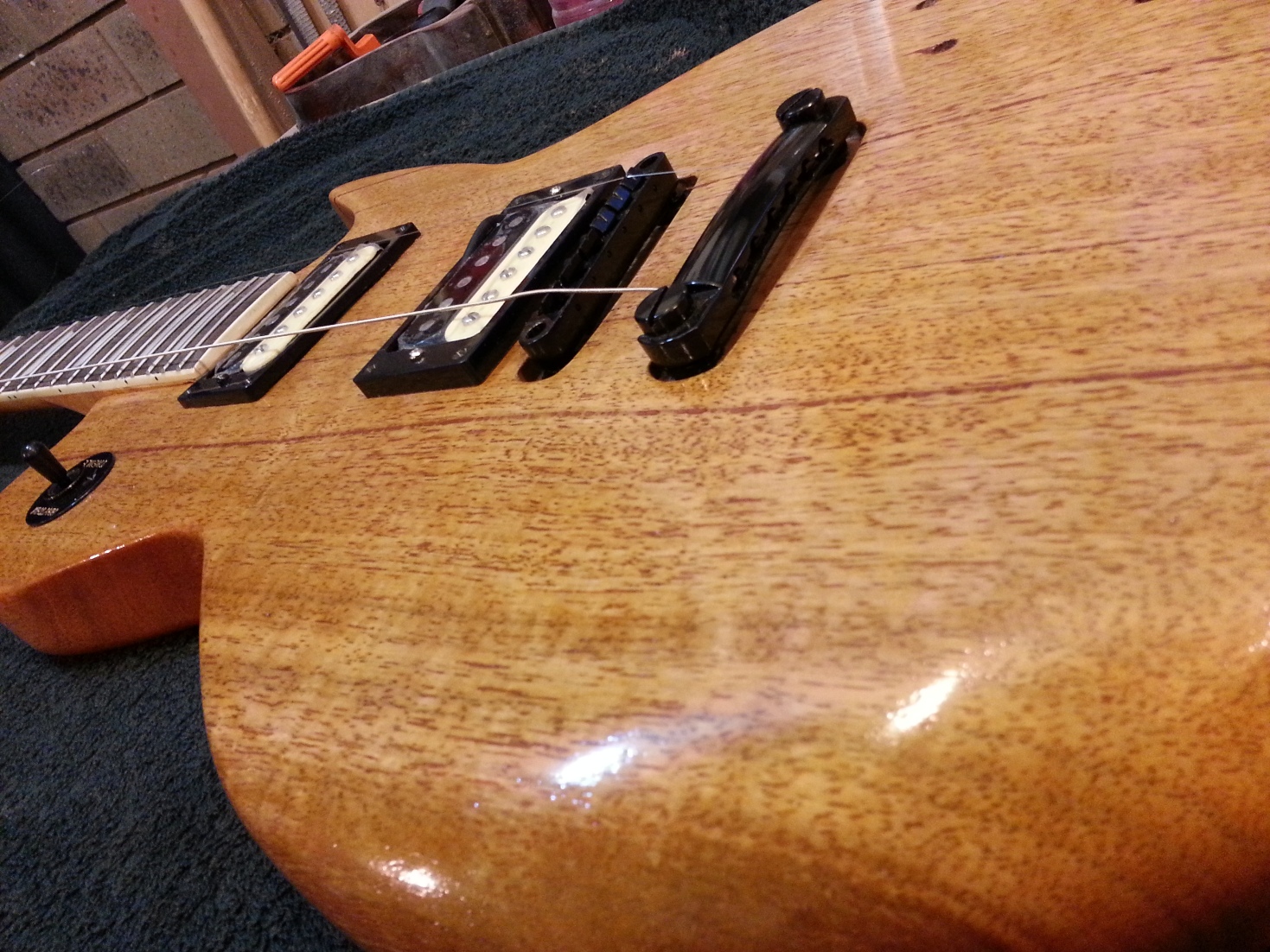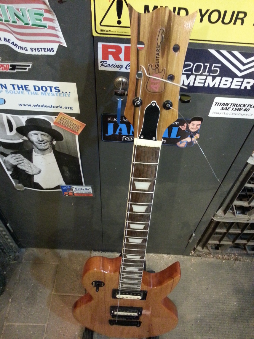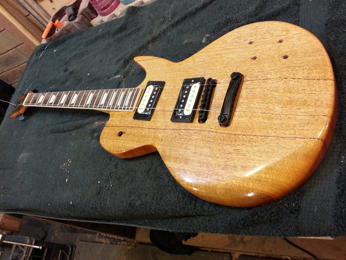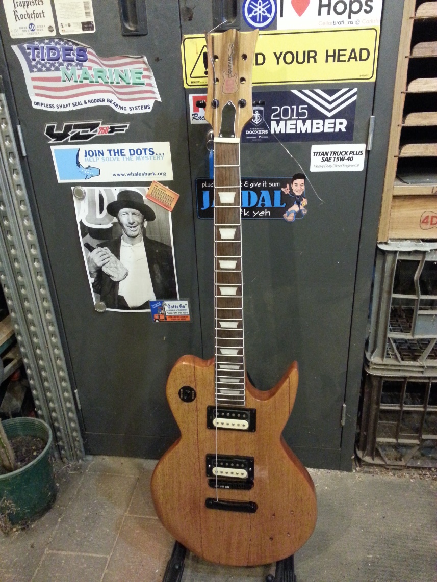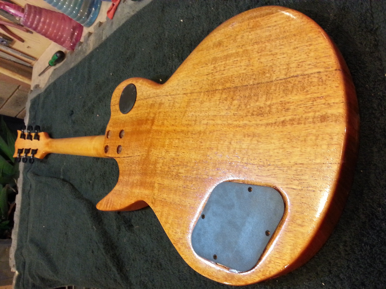 Never built a LP shape so wanted it a bit different put a small tele-ish dip above the neck and made the horn longer. Still need to do some sanding and reshaping. Got the neck and pup cavities routed and a rough sand. Will probably attempt an arch top as it weighs a heap. Should get the control and switch cavities routed this arvo