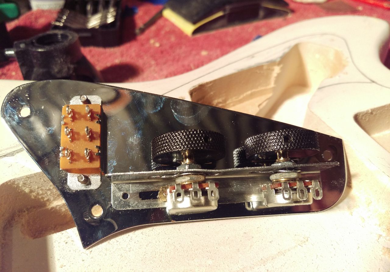 More routing, setting in lower switch panel, another sand and reprime, then final assembly to check neck, trem and string alignment. All is good. Ready for wiring and final 3 different paint coats.