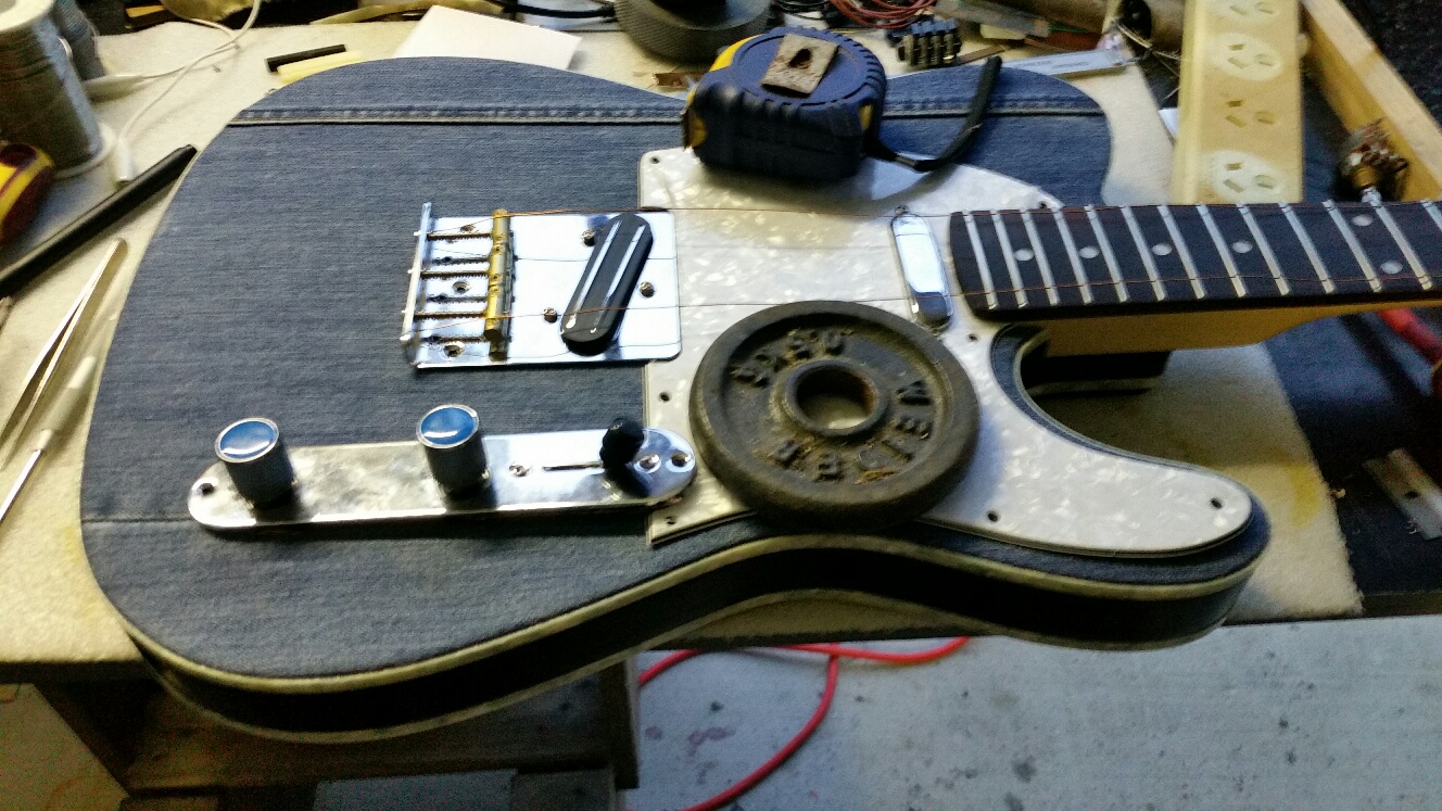 The bridge I intend using hasn't arrived yet but it is a chrome '62 Fender ash tray string thru with brass saddles. Hopefully it and the Grovers will get here this week.