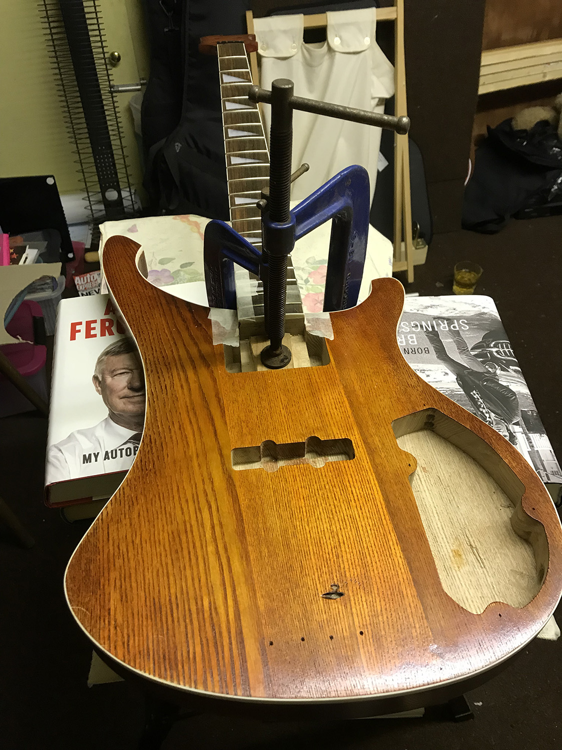 Not without a moment of drama. I had it clamped up and took these phots then, fortunately, took a closer look to make sure all was well and found a gap of a couple of mm between the heel and the edge of the neck pocket. Major panic but I got it sat properly and re-clamped and all is looking well now.