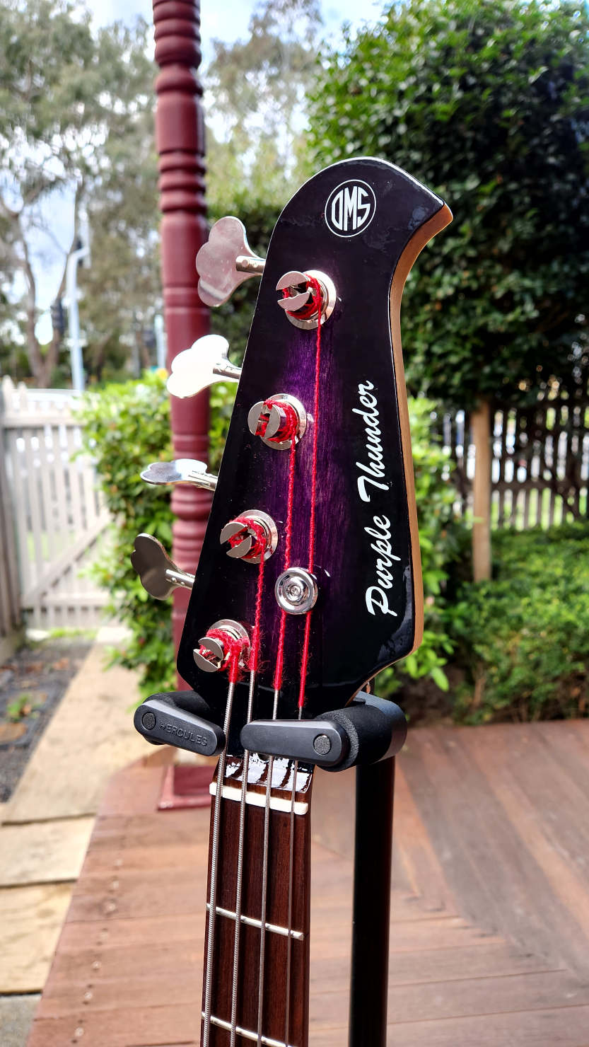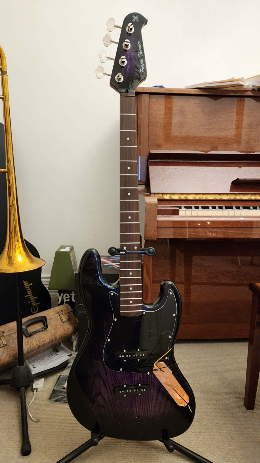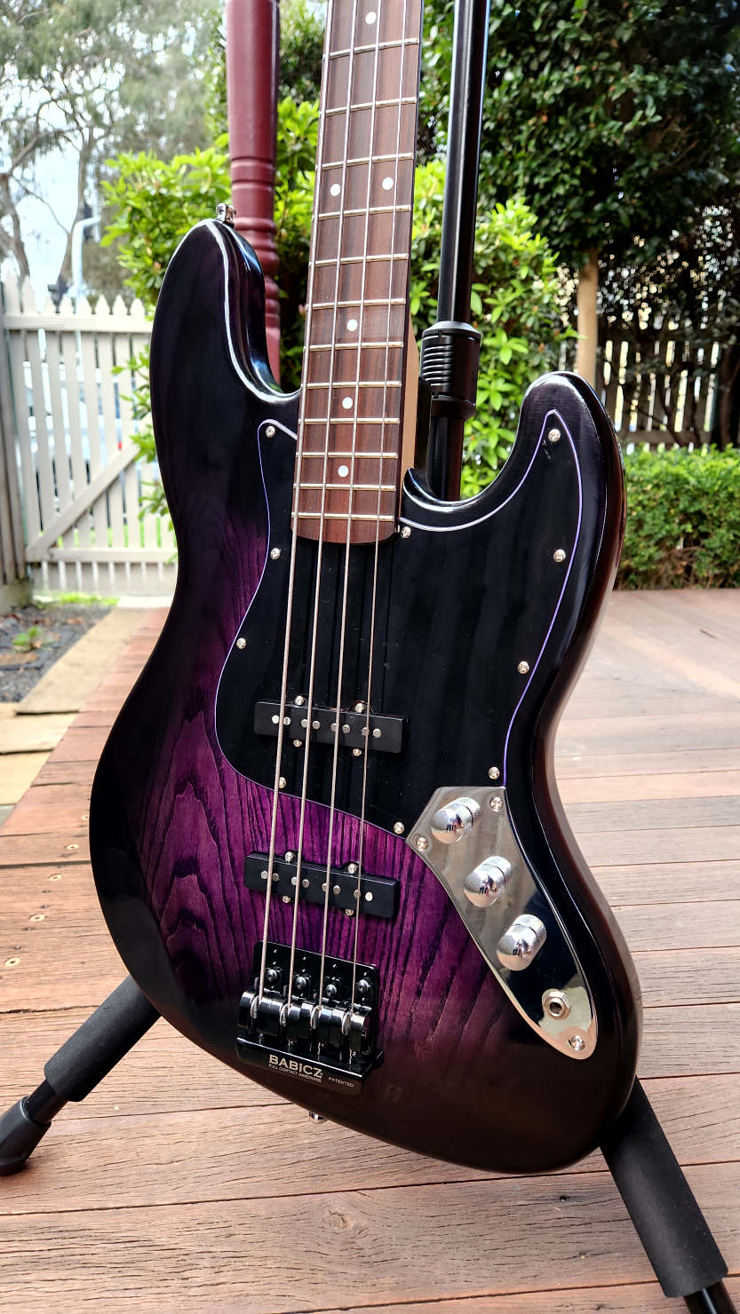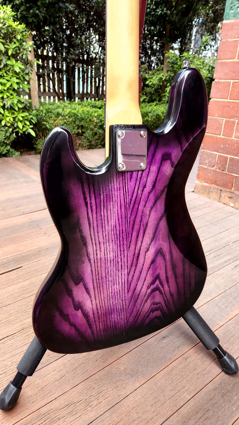 The look is precisely what I set out to achieve, with a black burst around a deep purple centre and a headstock to match.